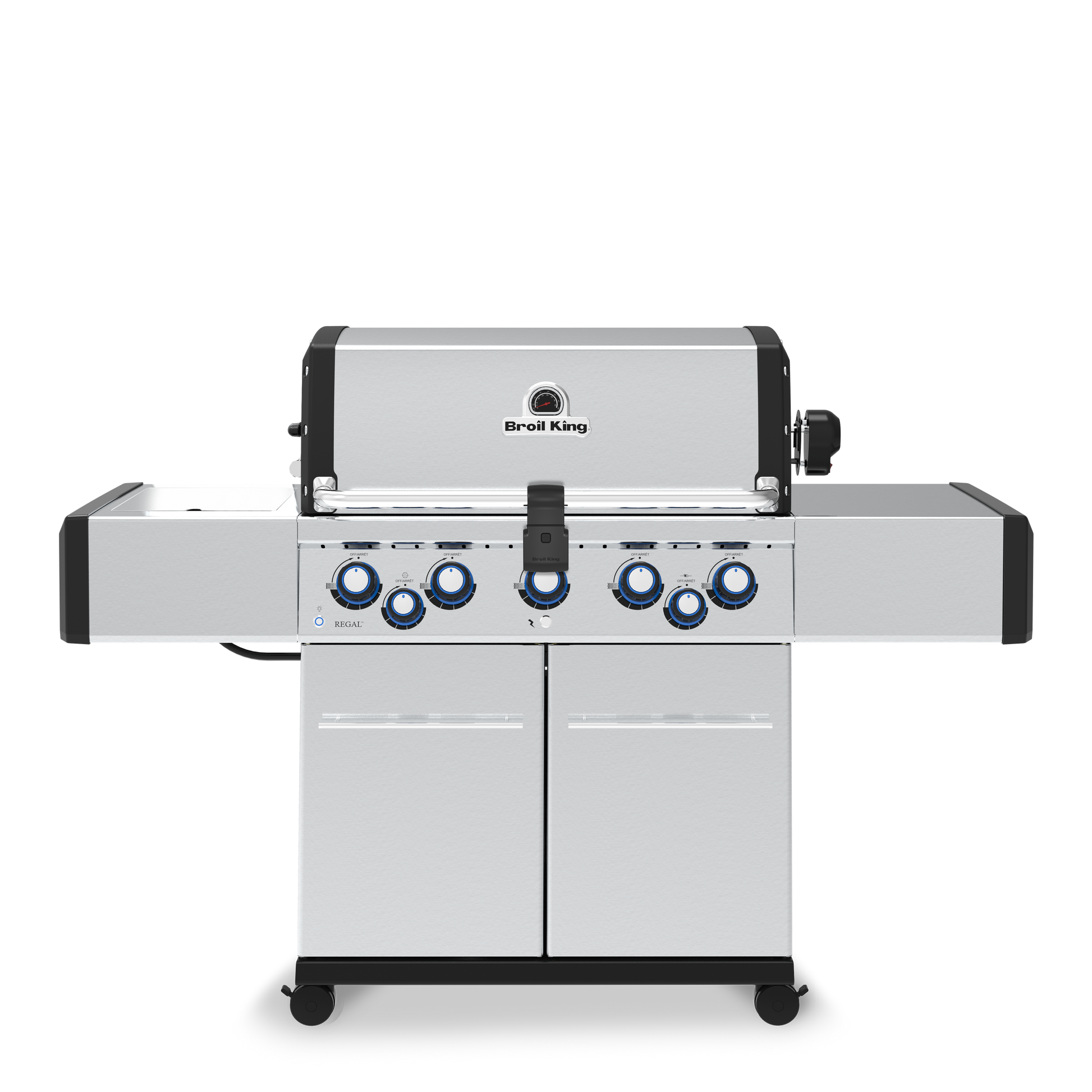 Le Regal S590 Pro de Broil King offre une surface de cuisson d’un total de 875 po2, y compris une grille de réchaud en acier inoxydable, des grilles de cuisson en acier inoxydable en V (réversible), un système de cuisson Flav-R-Wave en acier inoxydable, 5 brûleurs en acier inoxydable Dual-Tube, un brûleur arrière pour la rôtisserie, des tablettes latérales en acier inoxydable, des boutons de commande illuminés et une base armoire fermée.