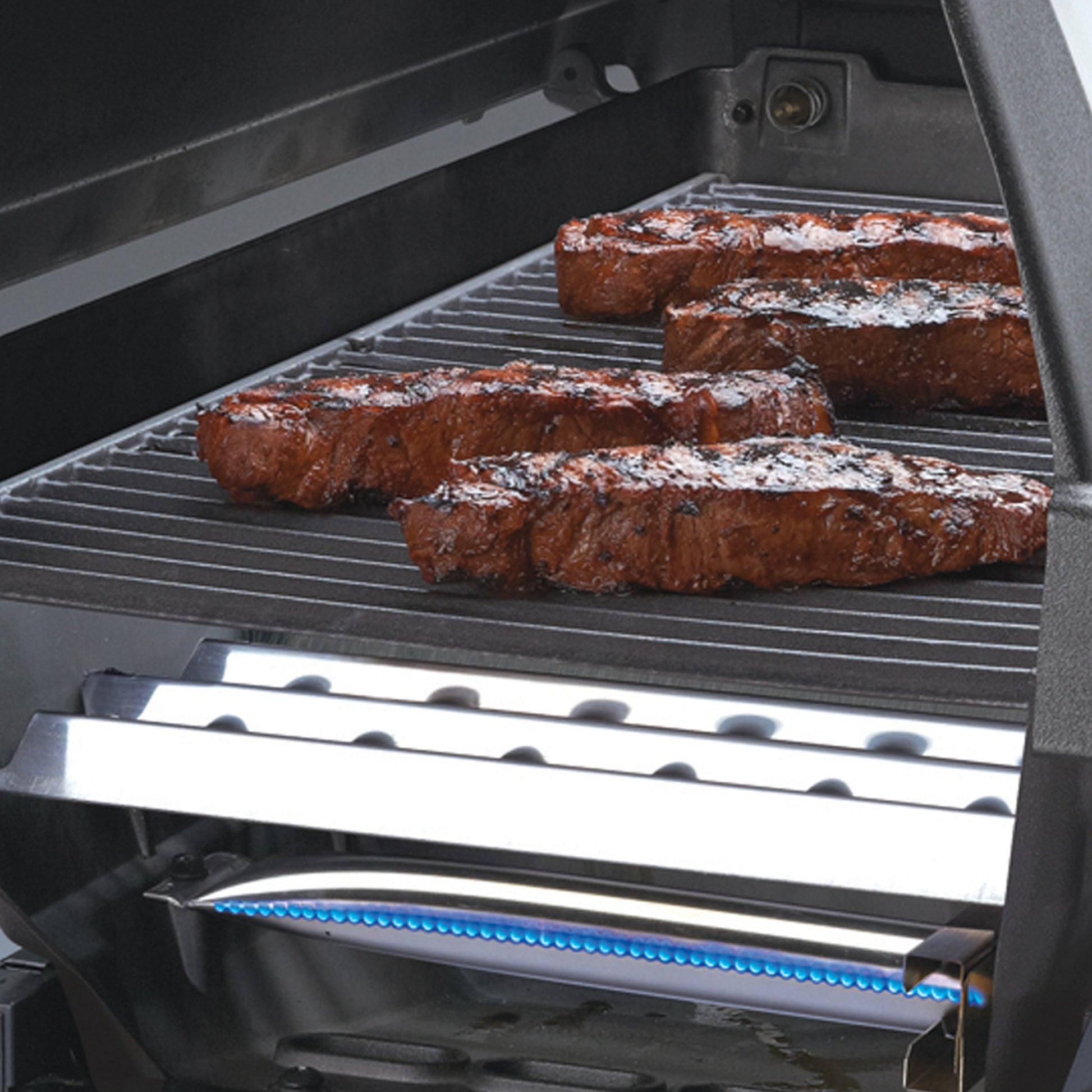 Le déflecteur en acier inoxydable en forme de vague protège le brûleur, tout en répartissant uniformément la chaleur sur votre barbecue. Chaque goutte de marinade ou de gras qui frappe cette barre se vaporisera instantanément et les saveurs de fumée et de marinade reviendront à votre nourriture.