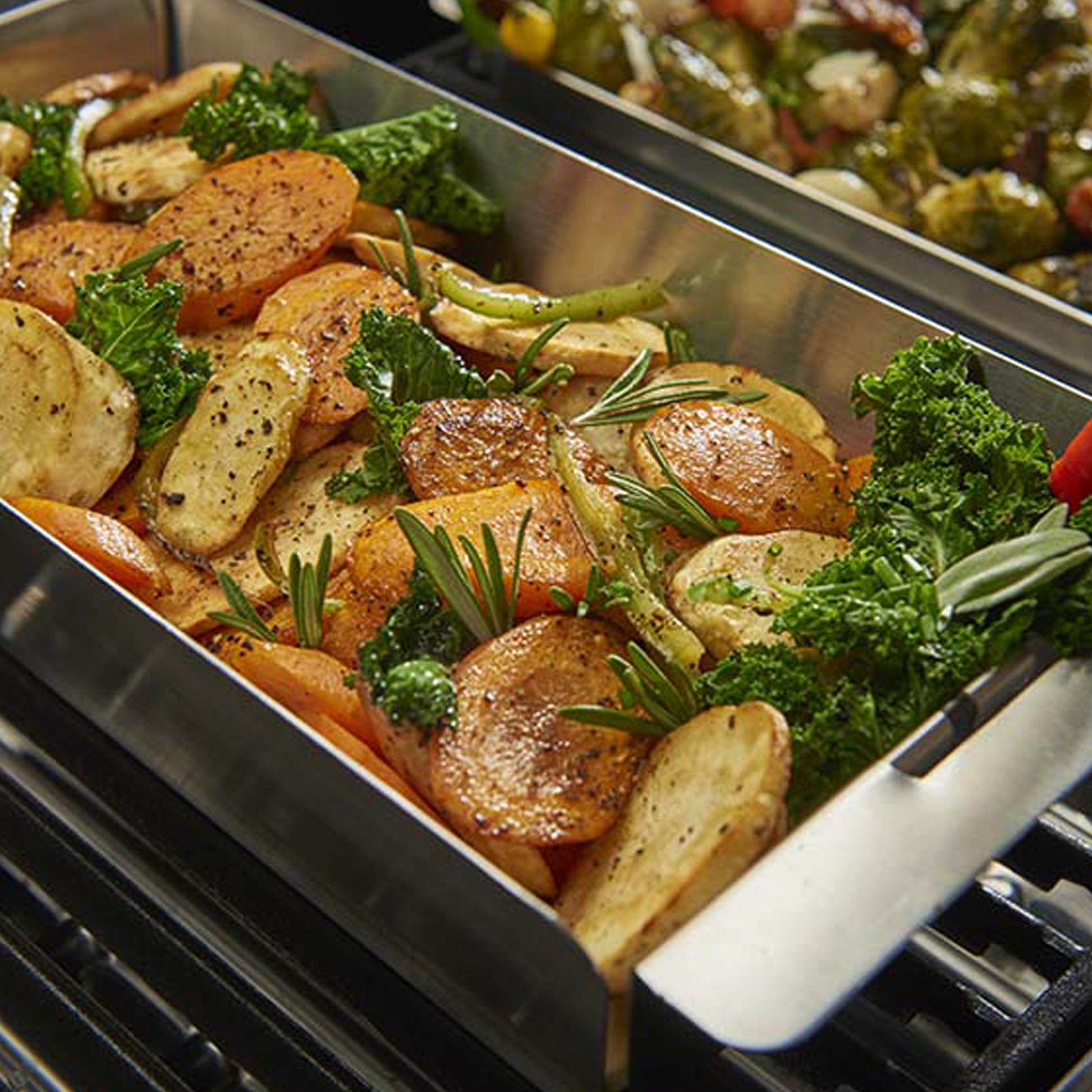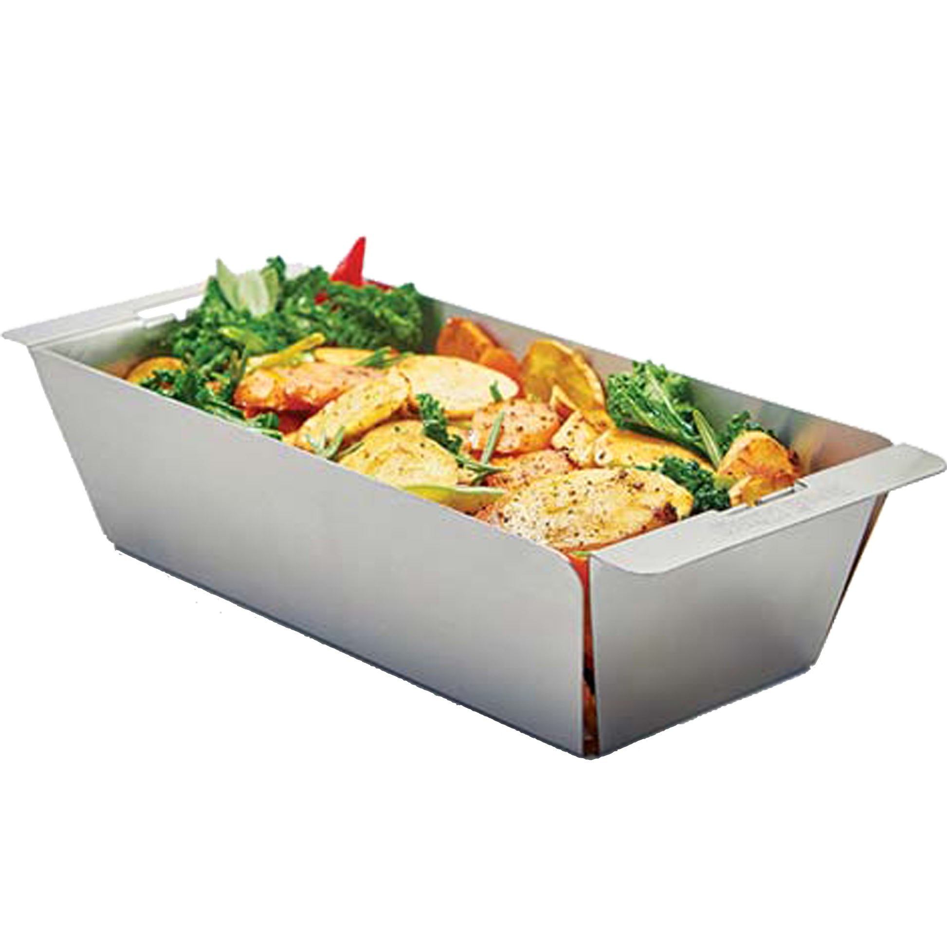 Un wok en acier inoxydable profond conçu pour s’asseoir sur les grilles. Tout en acier inoxydable avec un design d’enclenchement unique afin qu’il puisse fonctionner avec le 69722 la plaque étroite comme un plateau de fumoir autonome ou un panier à rôtir.