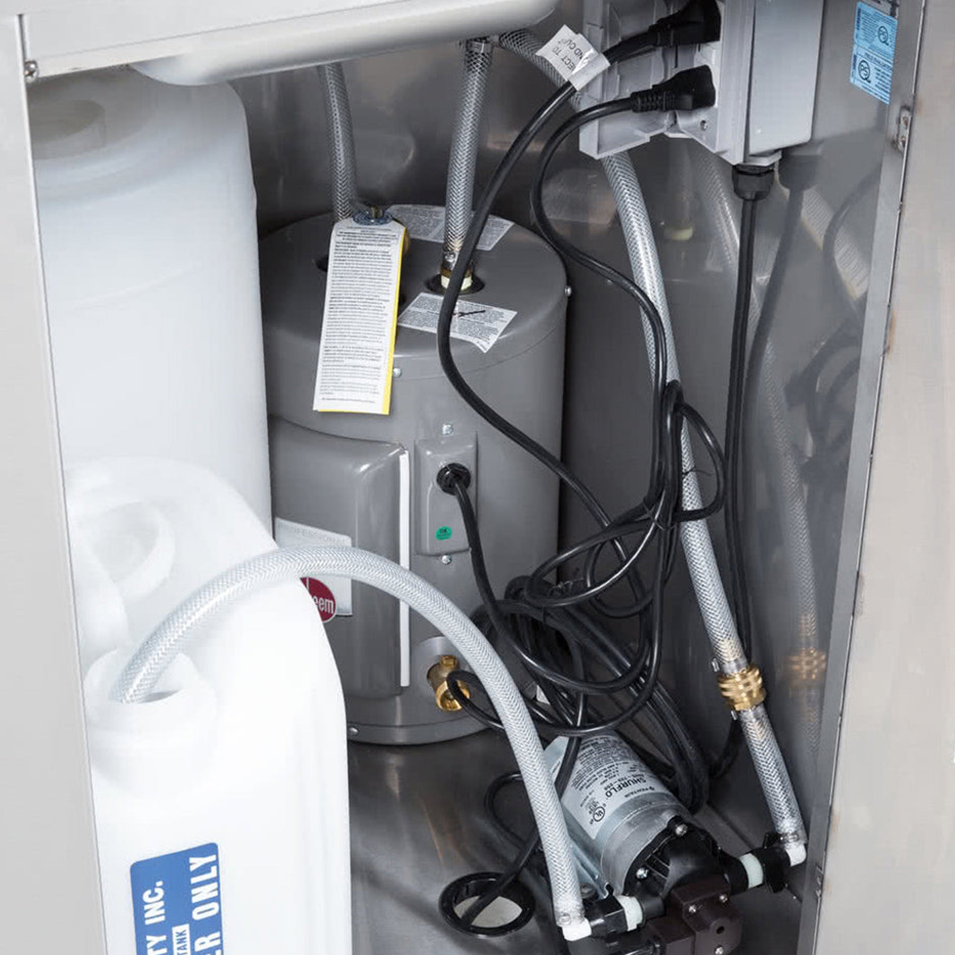 Évier simple eau froide seulement. L'ensemble inclus deux réservoirs de 5 gallons d'eau fraiche, deux réservoirs d'eau user, une pompe à savon et un porte serviette