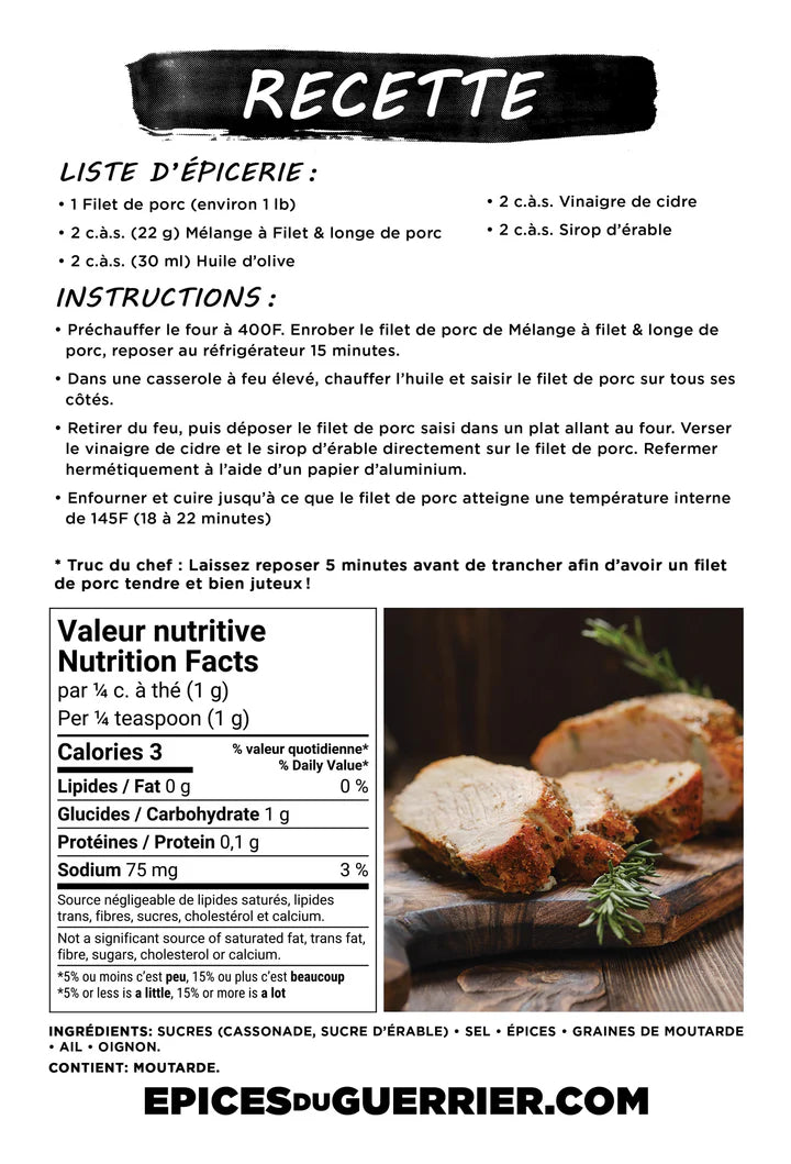 Spécialement conçu pour complémenter la finesse de la viande de porc, ce mélange d’épices sucré-salé aux notes d’érable légèrement fumées vous permettra d’apprécier chaque bouchée.