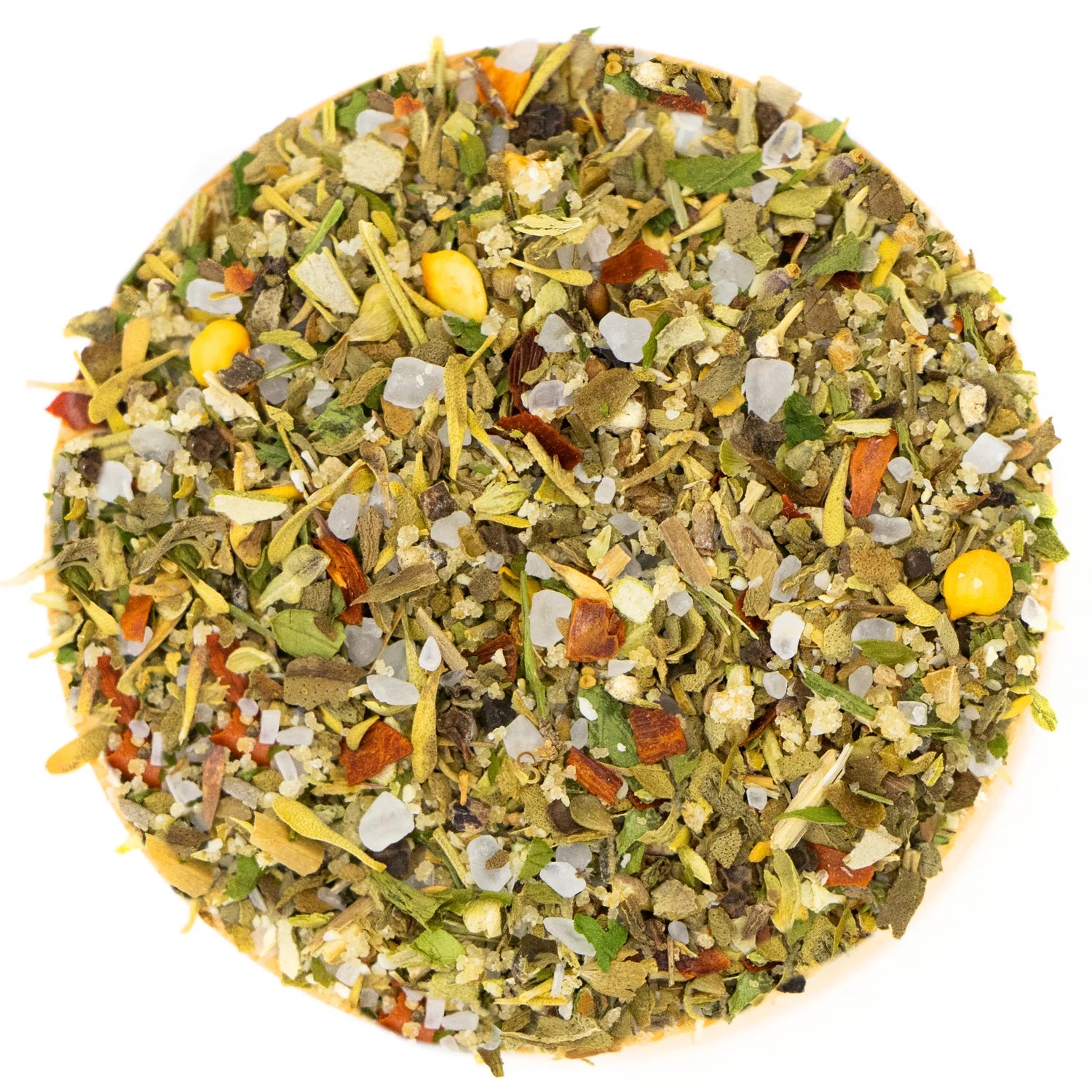 Basilic – Origan – Romarin – Persil séché – Thym séché – Chili broyés – Oignon granulé – Poivre italien – Sel de mer – Cassonade