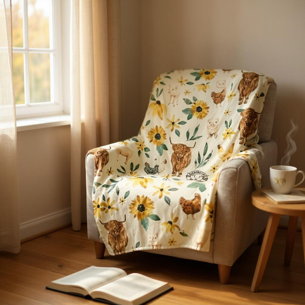 Conçue pour les moments doux en famille, cette couverture marie chaleur, tendresse et ambiance champêtre. On y retrouve les incontournables de la ferme – vaches Highland, cochons miniatures, poules – entourés de tournesols lumineux et de feuillage apaisant.