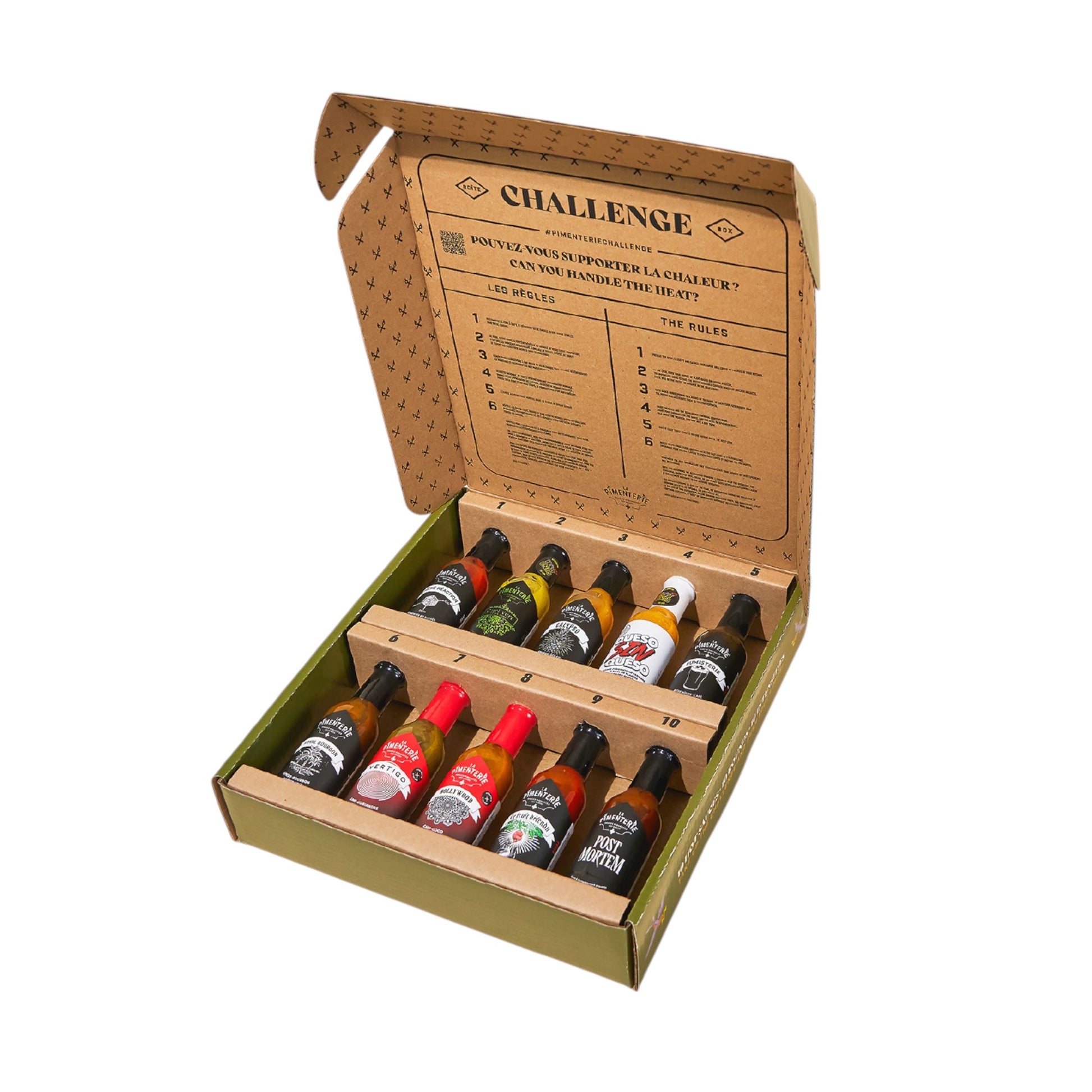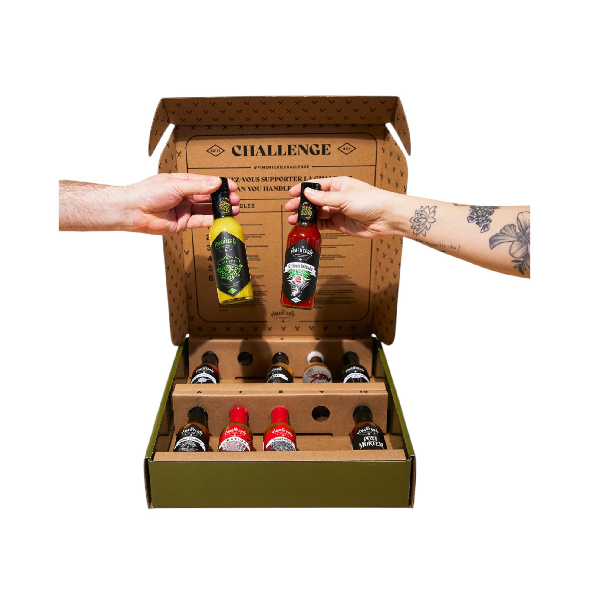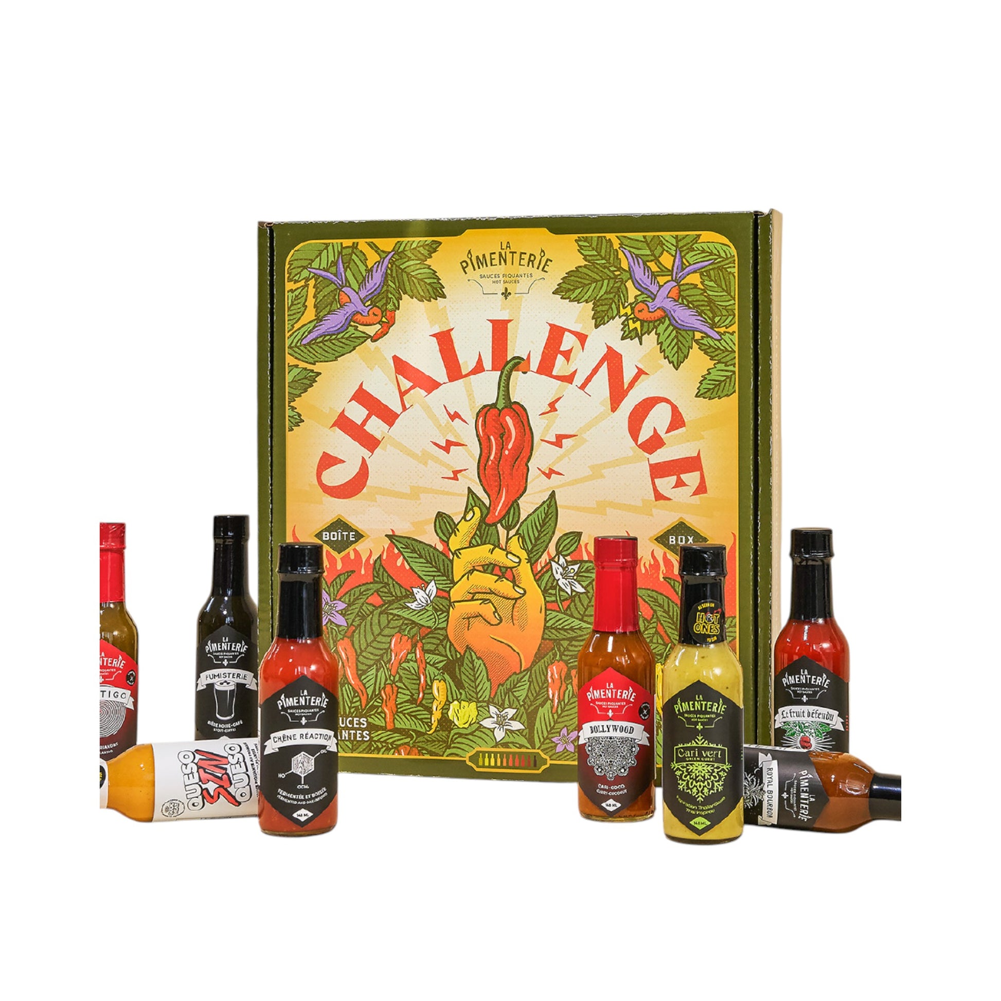 Plonge dans l’univers des sauces piquantes artisanales québécoises avec La Boîte Challenge, une expérience culinaire et ludique signée La Pimenterie. Ce coffret unique propose une montée en intensité à travers 10 sauces piquantes, parfaites pour animer tes soirées entre amis ou en famille.