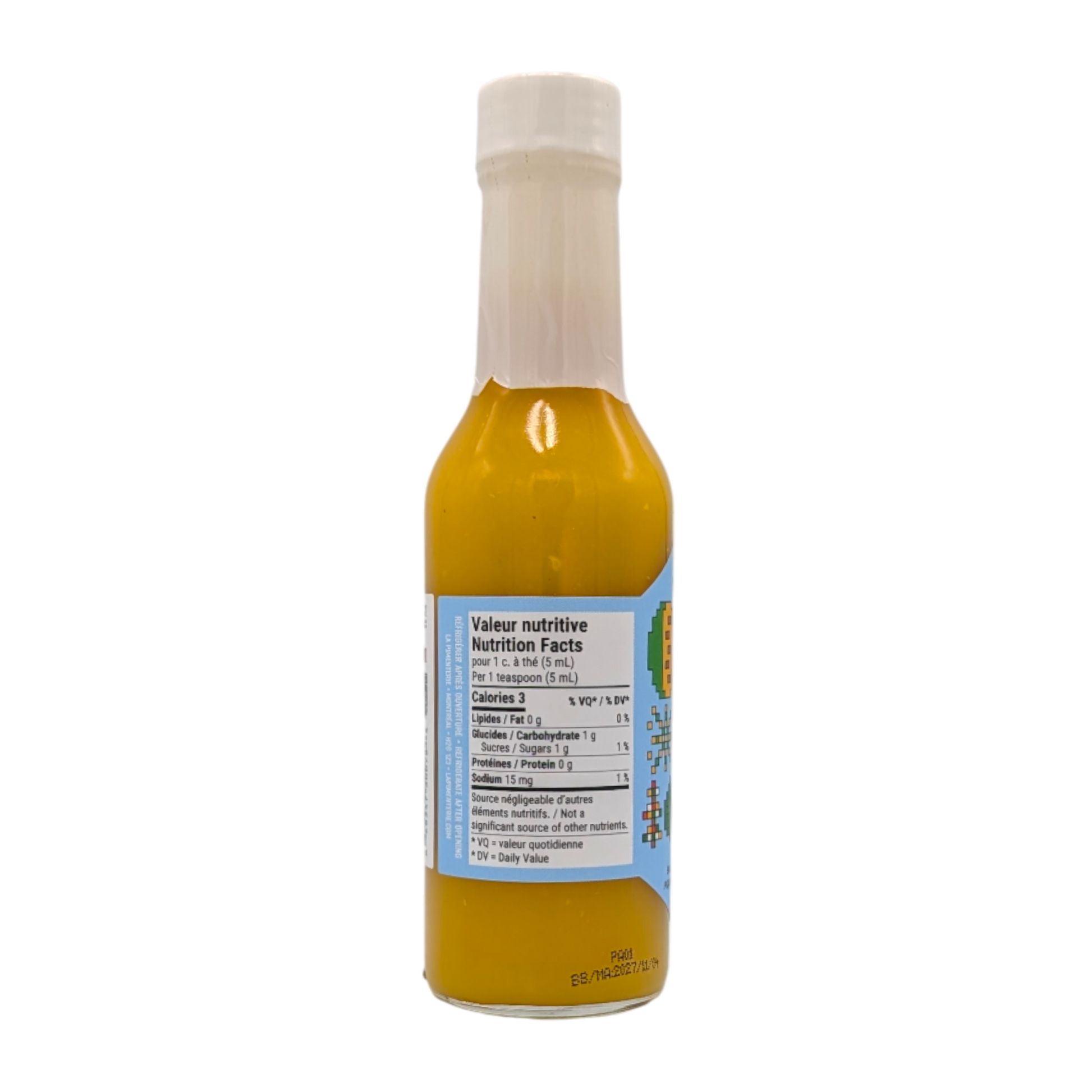 • Paw Paw • Poivron jaune • Courge • Eau • Vinaigre de cidre • Jus de lime • Piments forts (Sugar Rush, Trinidad Perfume, Scotch Bonnet, Aji Lemon) •Sucre de canne • Gigembre • Sel