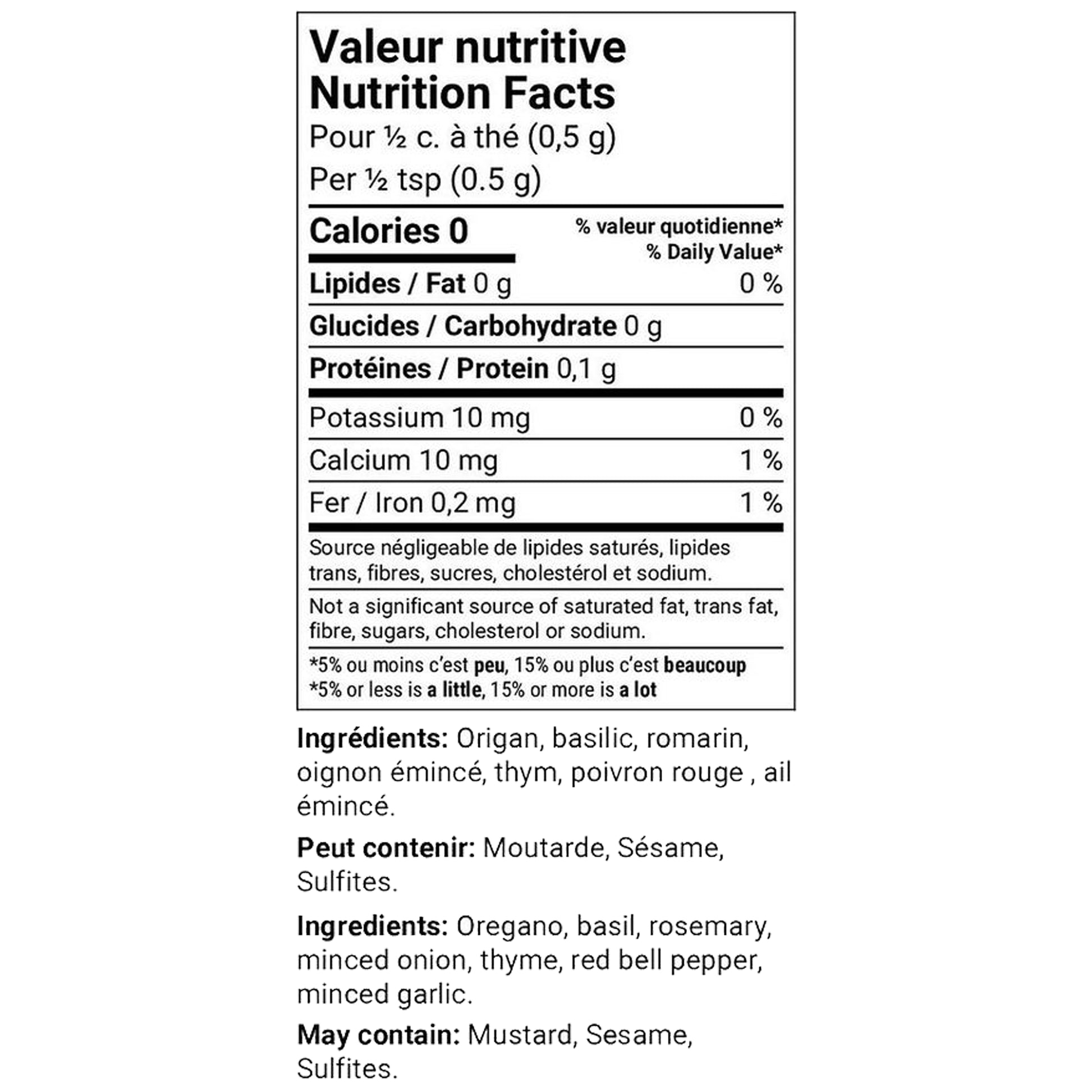 • Origan • Basilic • Romarin • Oignon émincé • Thym • Poivron rouge • Ail émincé.