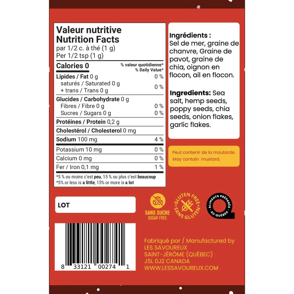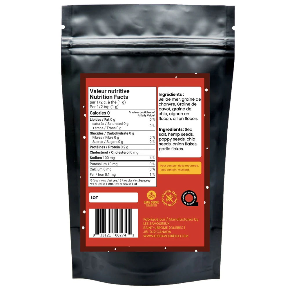 Ingrédients : Sel de mer, graines de chanvre, graines de pavot, graines de chia, oignon en flocons, ail en flocons.