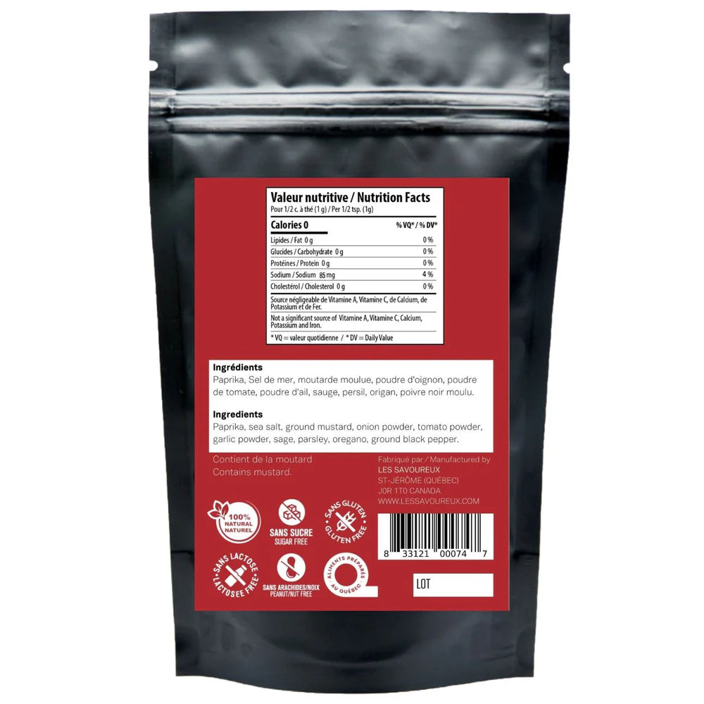 Ingrédients : Paprika, sel de mer, moutarde moulue, oignon en poudre, tomate en poudre, Ail en poudre, sauge, persil, origan, poivre noir moulu.