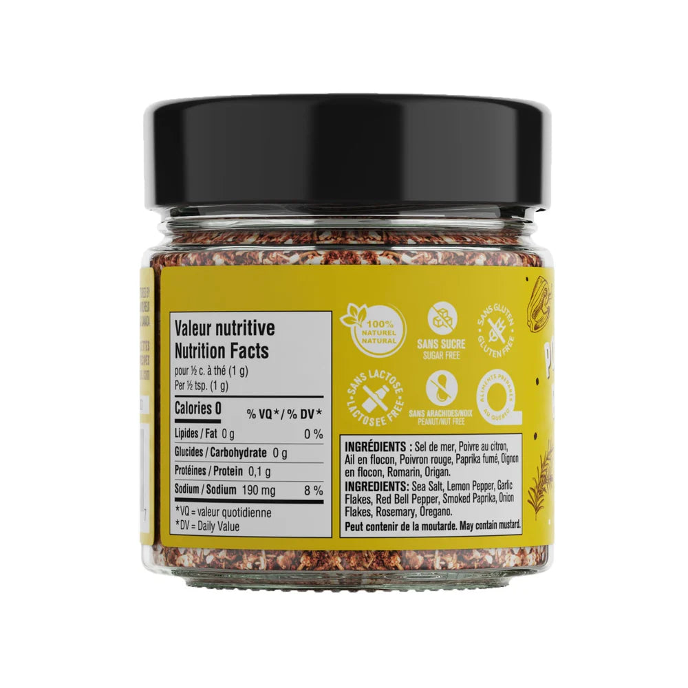 Ingrédients : Sel de mer, poivre au citron, ail en flocons, poivron rouge, paprika fumé, oignon en flocons, romarin, origan.