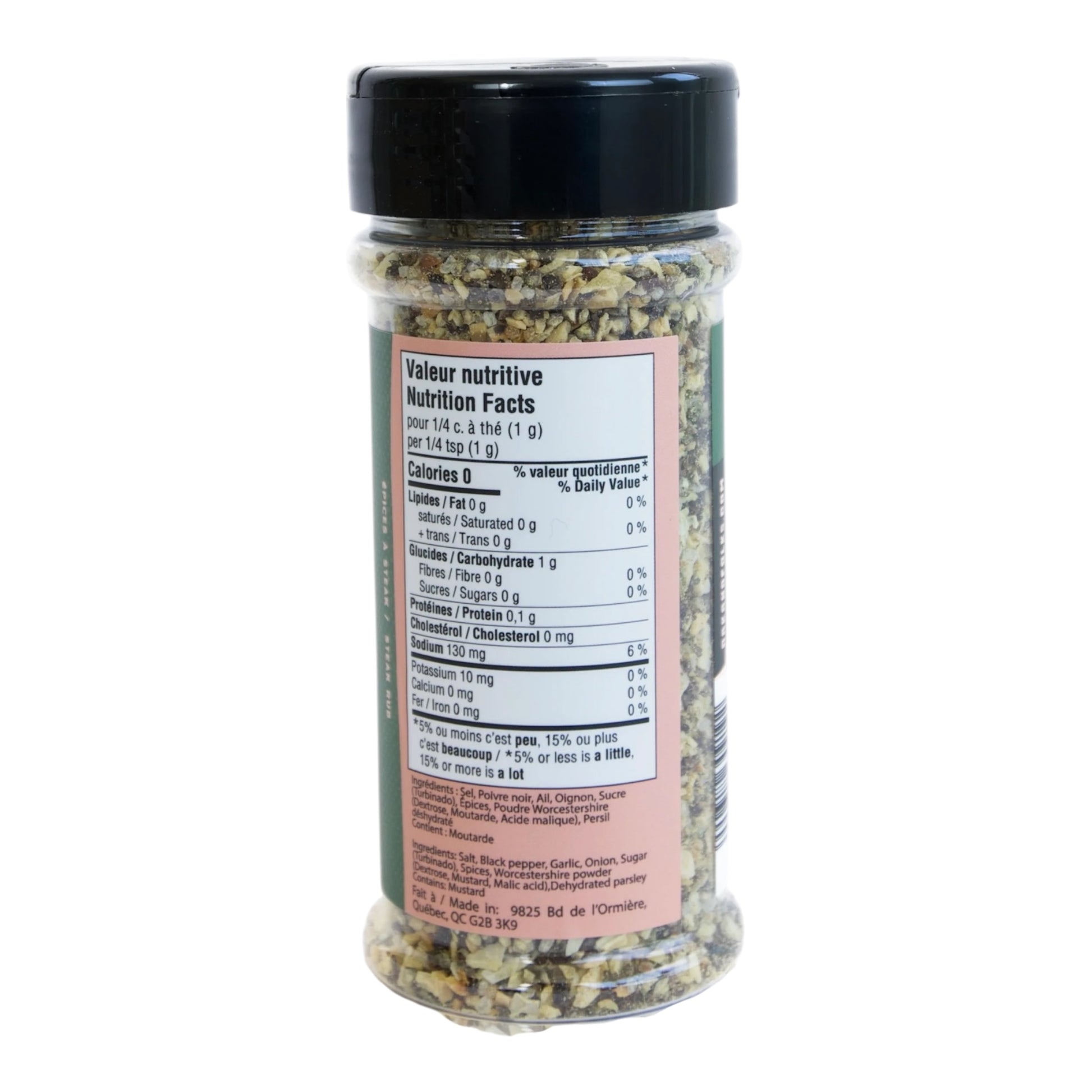 Sel, Poivre noir, Ail, Oignon, Sucre (Turbinado), Épices, Poudre Worcestershire (Dextrose, Gomme de cellulose, Moutarde, Acide malique), Persil déshydraté