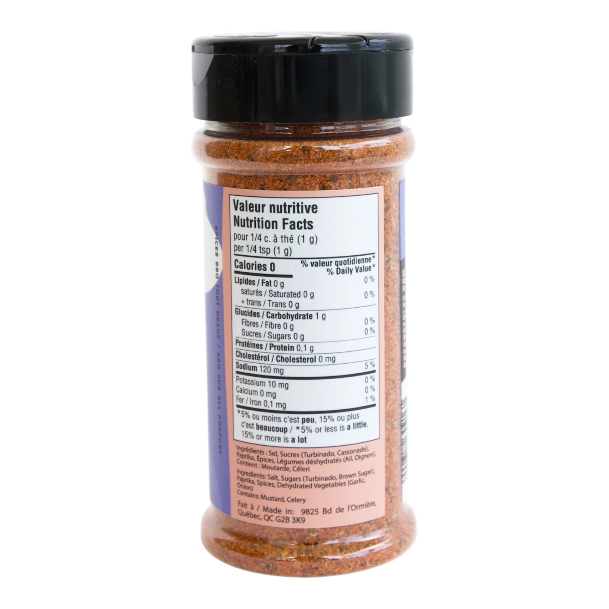 Sel, Sucres (Turbinado, Cassonade), Paprika, Épices, Légumes déshydratés (Ail, Oignon)