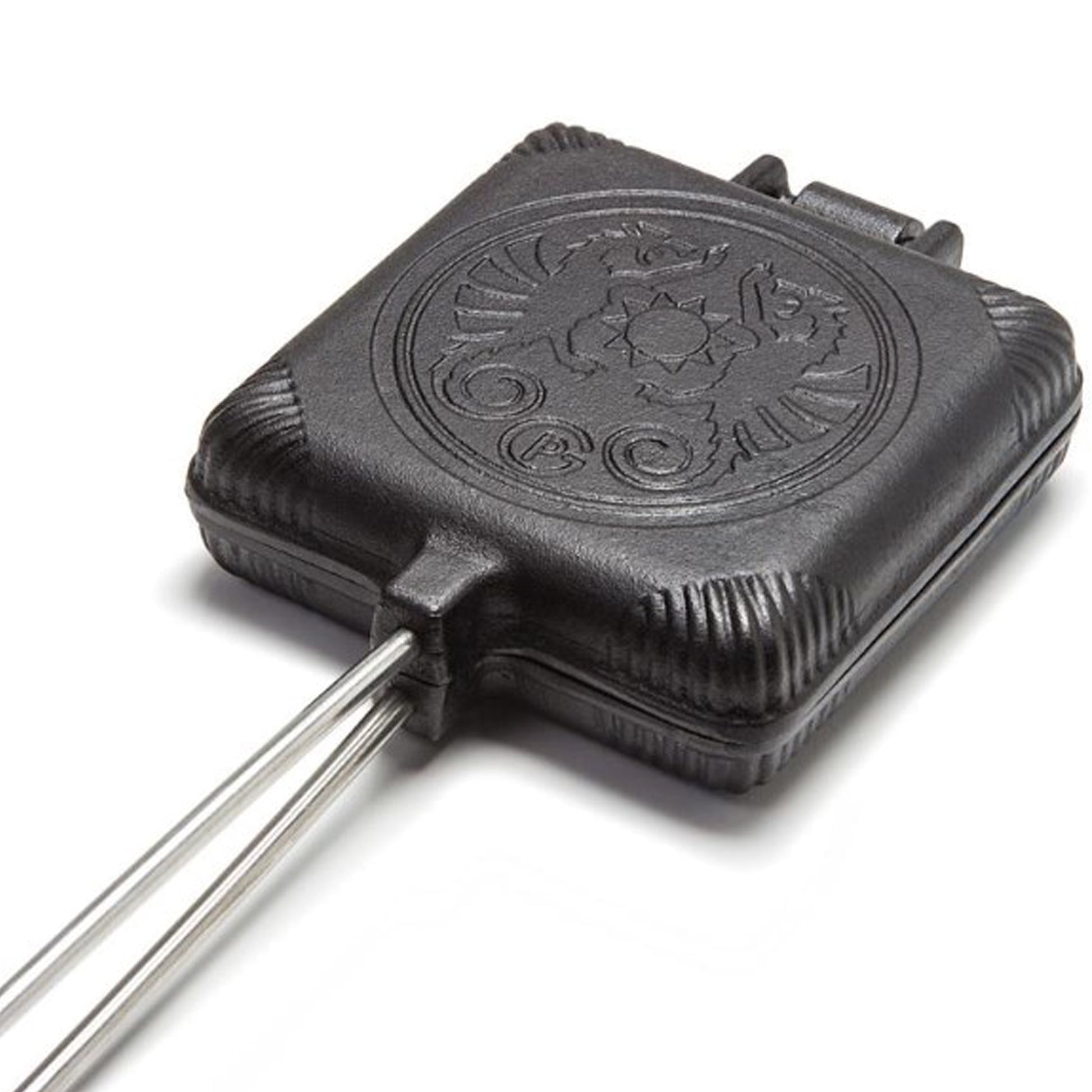 Les poignées en bois tiennent bien dans la main et la longue tige permet un écart suffisant par rapport à la source de chaleur. La fonte étant traitée par culottage, elle est utilisable immédiatement. Pour le nettoyage, il te suffit de séparer les deux moitiés en fonte grâce à la charnière. En nettoyant, tu profites d’ailleurs des formidables propriétés de la fonte, puisqu’elle a un effet antiadhésif naturel.
