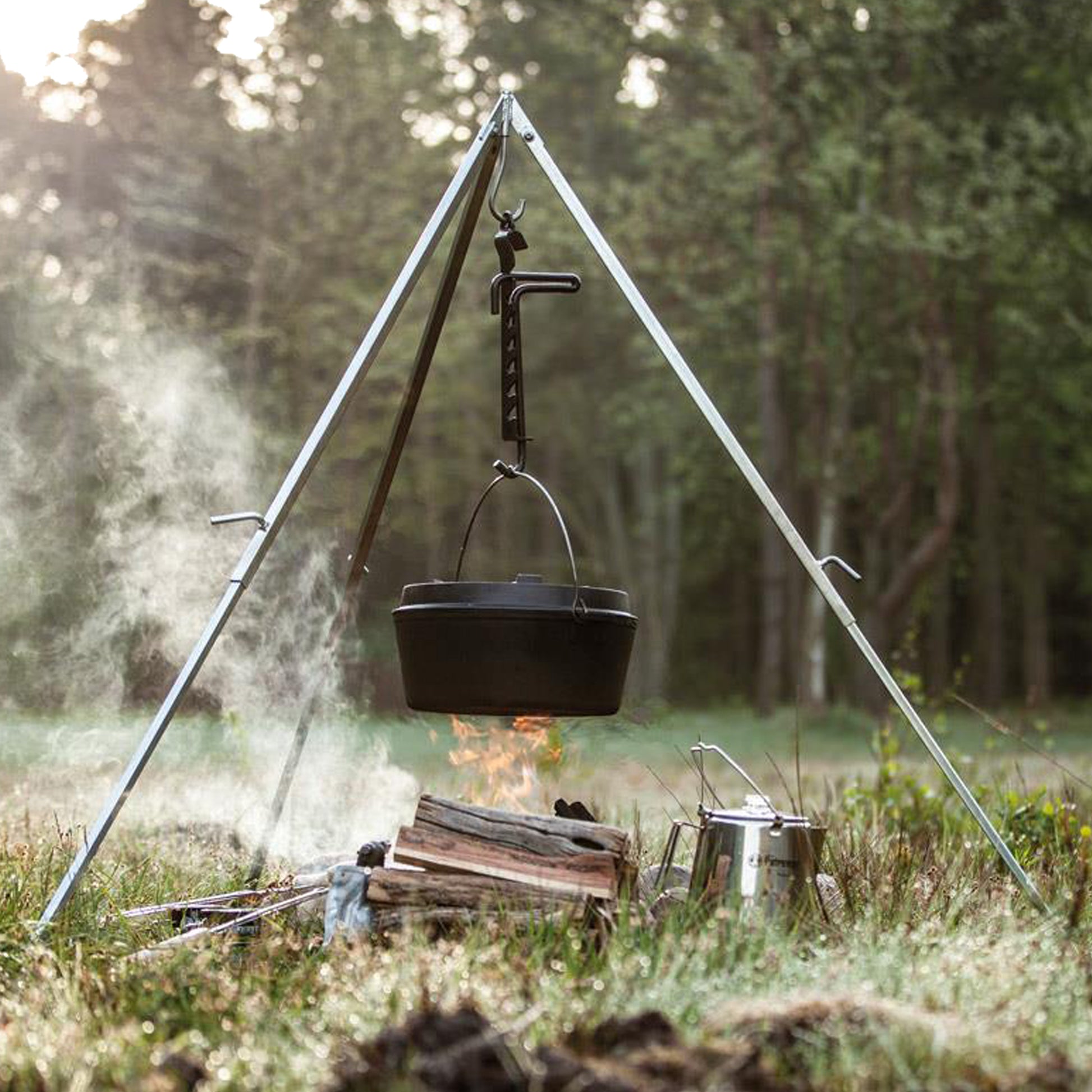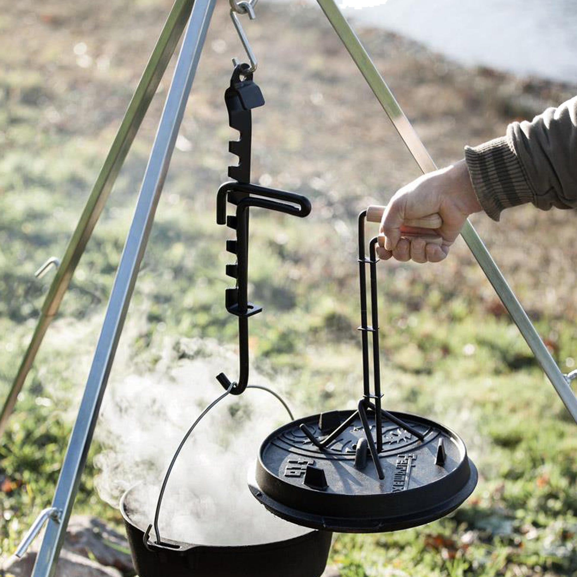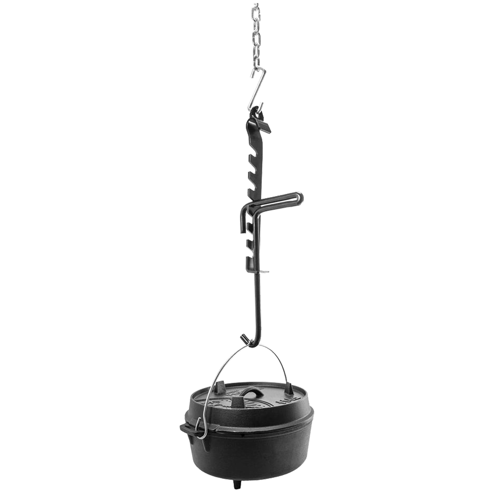 La Crémaillère Petromax faite en acier pourvu d’un revêtement apporte ce principe déjà transmis depuis le Moyen Âge dans de la cuisine moderne en plein air. Sur le support massif, tu peux accrocher régulièrement des bouilloires et des marmites lourdes sur ton feu de camp. Grâce aux sept dents de cette scie à bouilloire, tu en as littéralement souvent sous la pédale quand tu te sers de ta cuisine en plein air. Il te permet de varier facilement la distance entre la marmite ou la bouilloire et la température de cuisson de tes repas. Grâce à sa suspension pratique; à savoir une combinaison d'œillets et d'une courbe; tu peux fixer ta Crémaillère aussi bien au trépied de suspension comme à la barre transversale de ta zone de cuisson au-dessus du feu. Grâce au guide inférieur du dispositif, la scie ne peut pas s'enlever pendant l'utilisation. Une cuisine en plein air sûre est donc garantie.