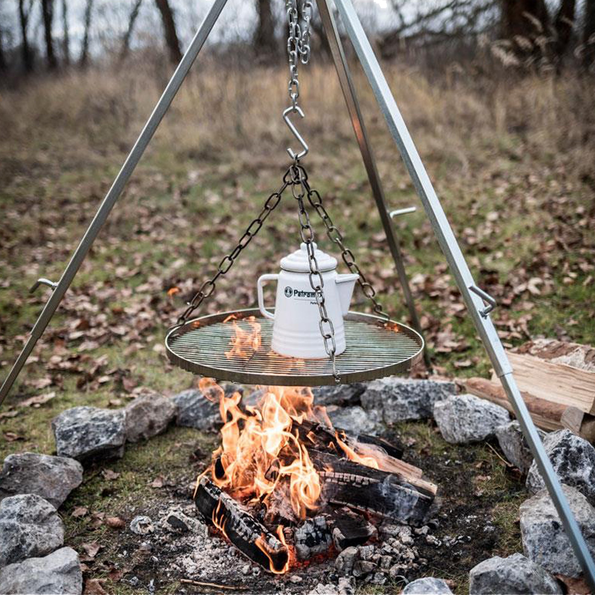 La grille de cuisson pour le Trépied de suspension Petromax donne à votre cuisine en extérieur, autour du feu de camp, un goût d’authenticité. La grille en acier chromée se fixe en un rien de temps au crochet du trépied, au moyen de trois chaînes stables et est directement prête à être utilisée. La distance entre le feu et la plaque de cuisson se règle facilement grâce à la chaîne du trépied. Le mouvement de balancement naturel fait cuire vos victuailles en douceur en ne les exposants pas aux flammes de façon constante.