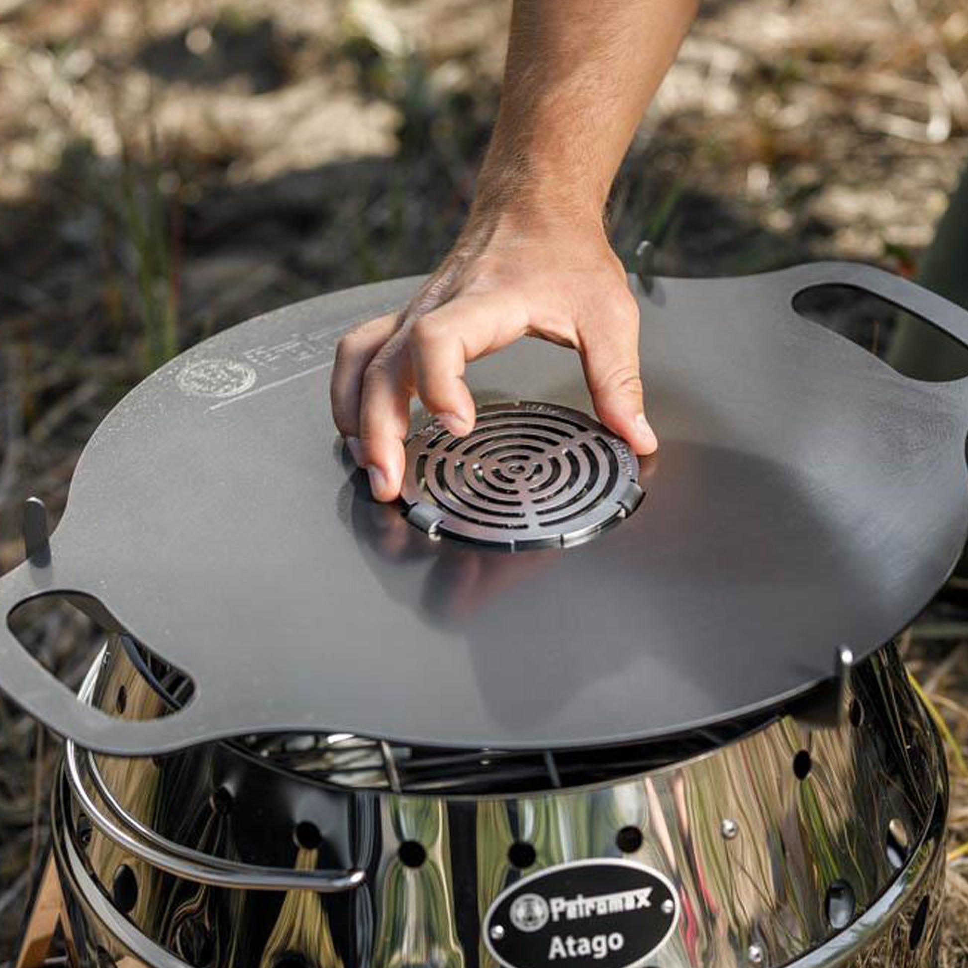 L'Insert Petromax complète parfaitement La Plaque de cuisson Atago. Il offre encore plus de possibilités et permet d´obtenir de belles marques de grillé lors des grillades à la plancha sur la Plaque de cuisson. Il s´intègre facilement sur la Plaque ou sur le Support, complétant ainsi votre Plaque de cuisson Atago en lui ajoutant de nouvelles fonctions. L´Insert vous permettra de placer les aliments au centre de la Plaque de cuisson. Elle servira également de mini-grille et d´emplacement stable pour les Marmites et les Poêles. L'Insert pour Plaque de cuisson Atago permet d’obtenir les marques typiques de barbecue sur les steaks, les filets et les légumes tandis que les pommes de terre rôties ou les œufs au plat cuisent simultanément sur la Plaque de cuisson de l´Atago. Vous pourrez ainsi préparer une garniture croustillante tout en grillant un steak, en préparant une bonne sauce barbecue ou une soupe savoureuse pour l´entrée.