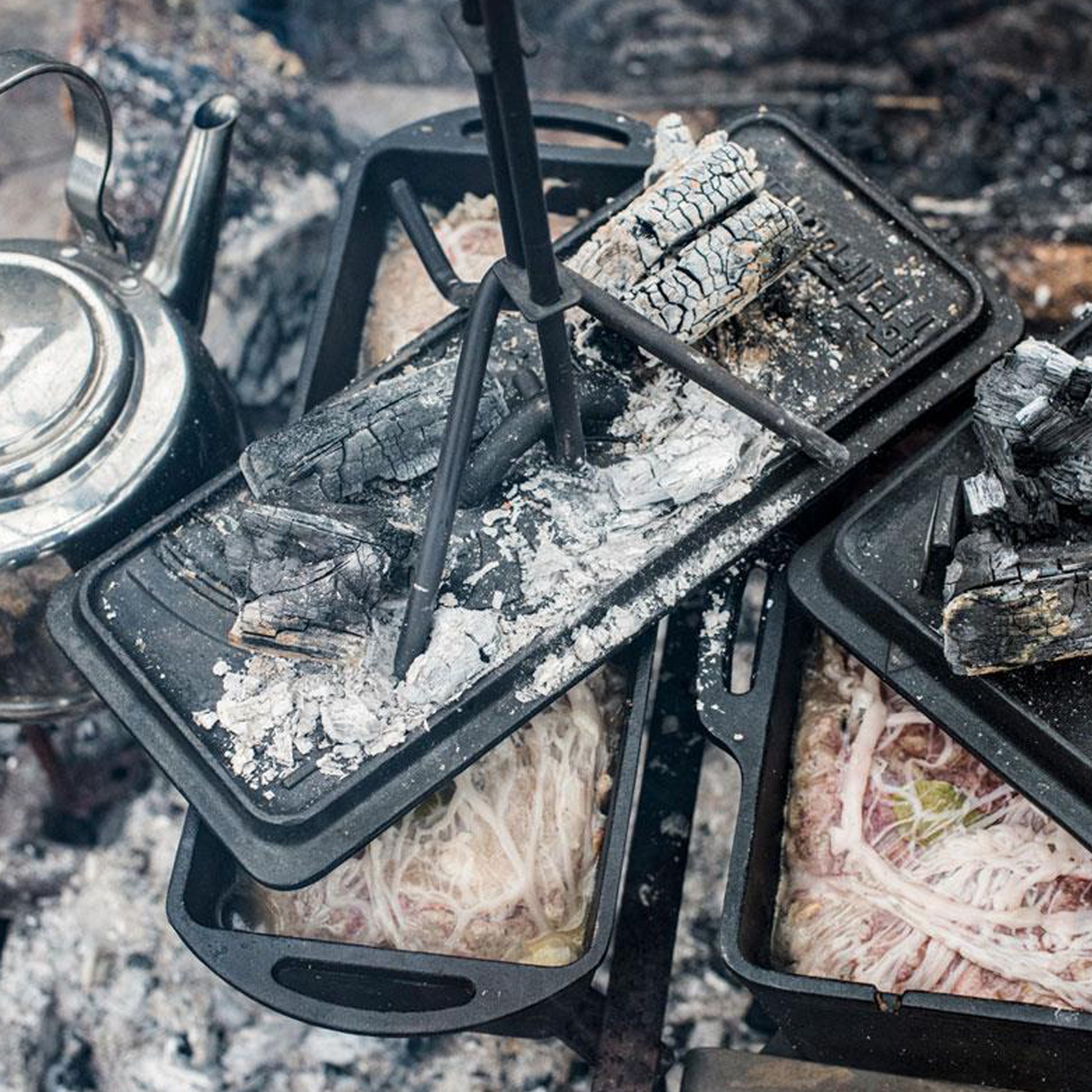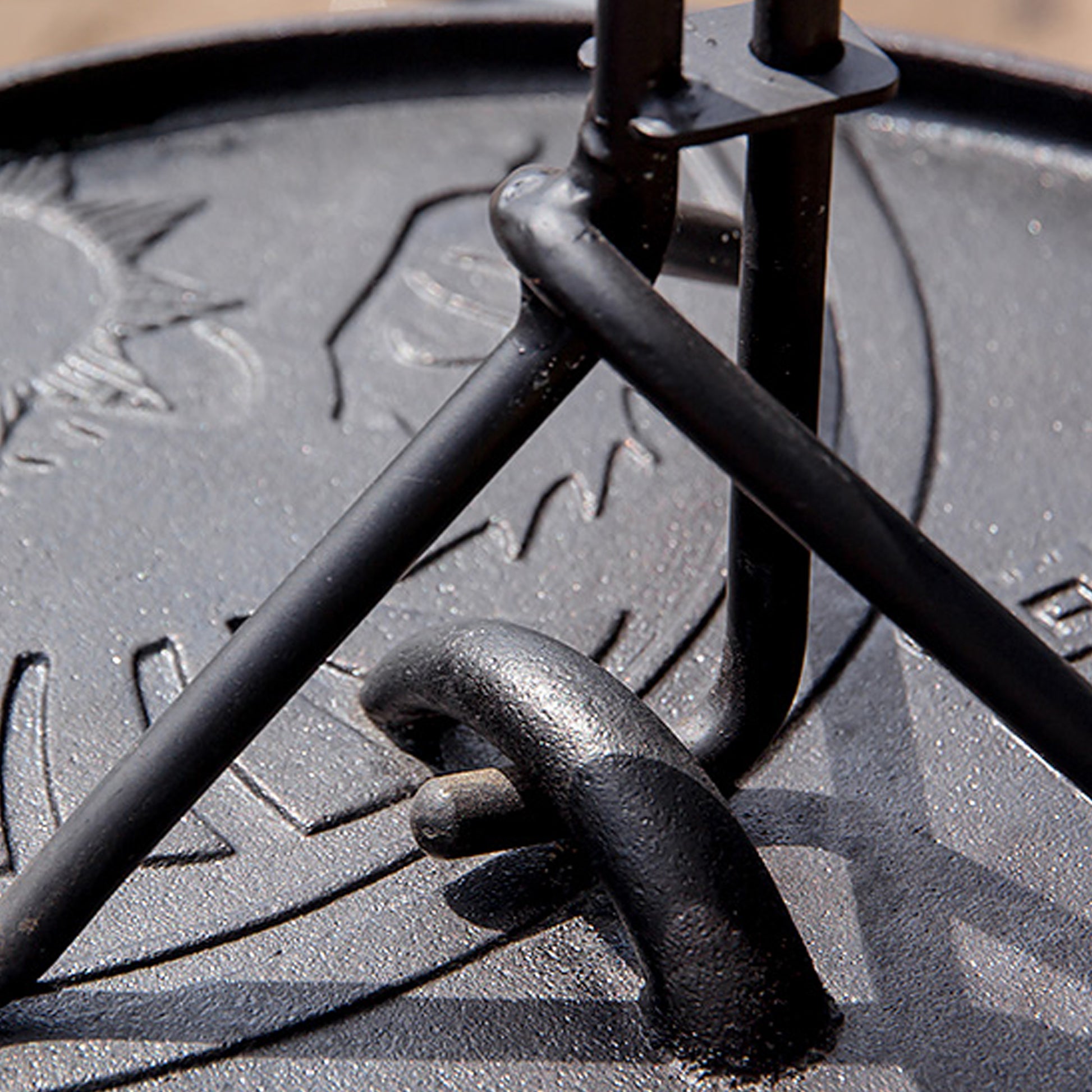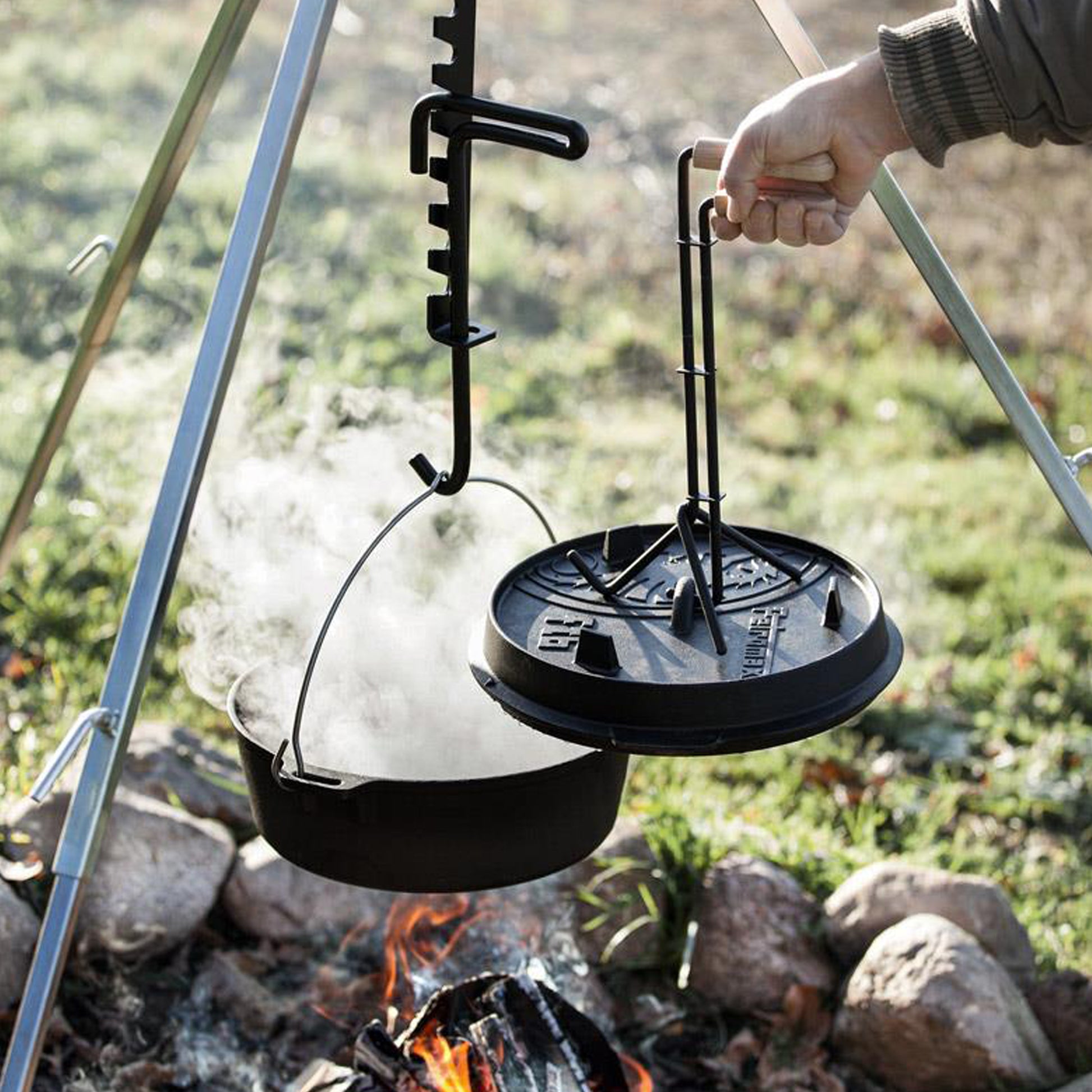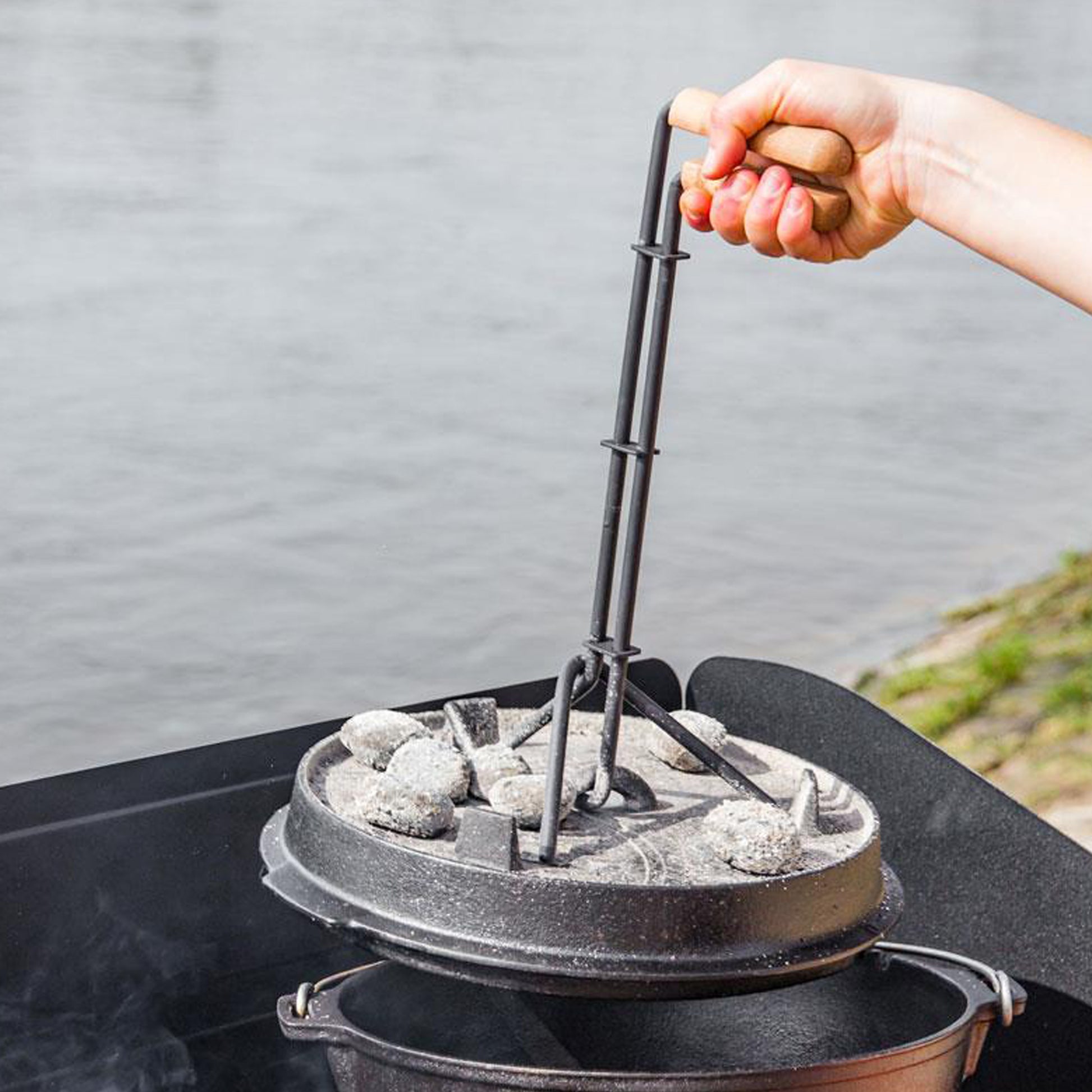 Grâce à ses pieds supplémentaires, le lève-couvercle professionnel est à disposition à tout moment à côté de la marmite en fonte ou du barbecue. Les pieds sont une sécurité supplémentaire qui vous permettent de contrôler le lourd couvercle brûlant lorsque vous le soulevez.