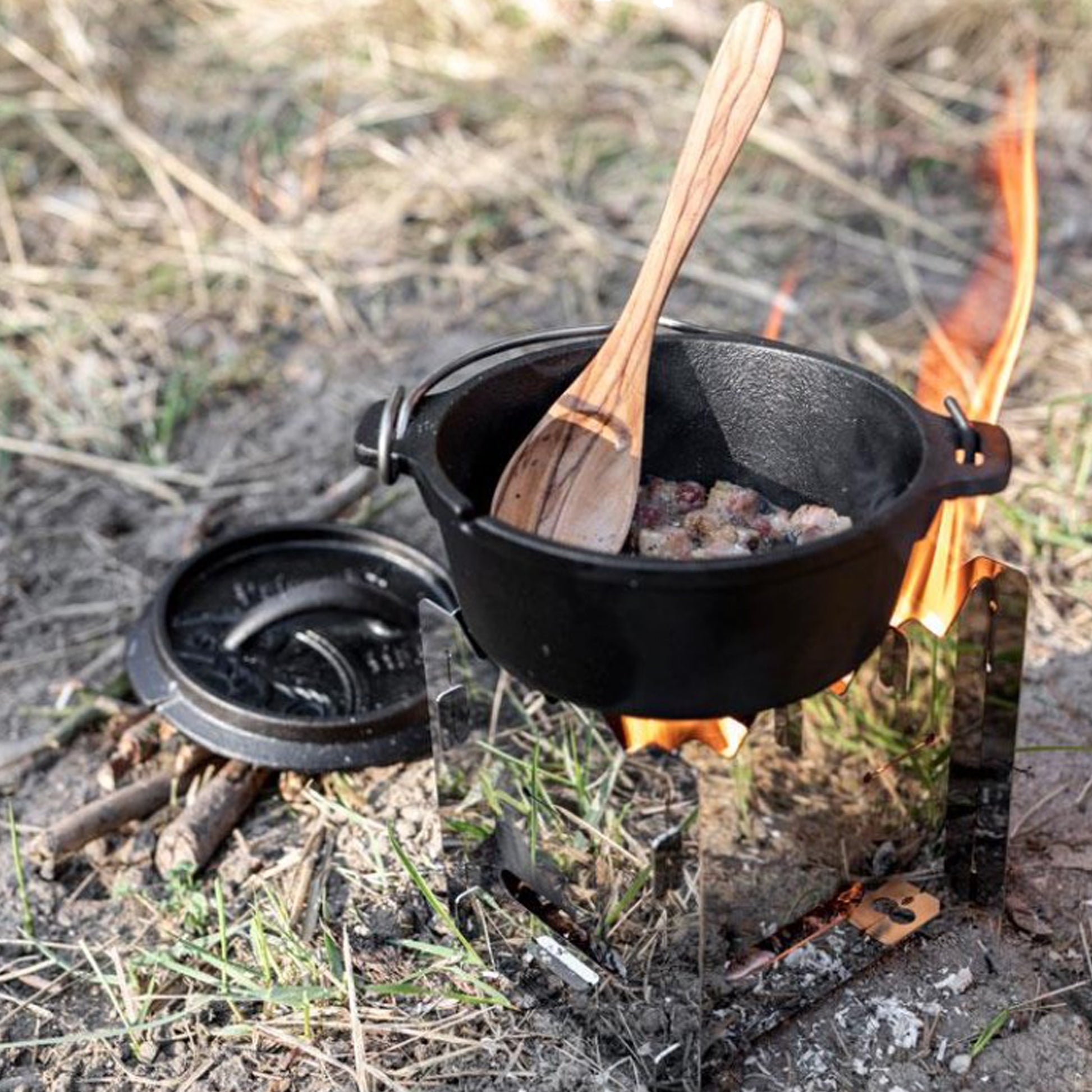 Grâce aux excellentes caractéristiques de la fonte et à la structure de surface particulière, la chaleur est conservée et distribuée de manière efficace. La surface pré-traitée (culottée) rend inutile un premier culottage et la marmite en fonte, robuste , peut être utilisée immédiatement. En plein air, elle est utilisée sur un feu ouvert ou avec du charbon et des briquettes. Grâce au bord surélevé du couvercle, braises et charbon peuvent y être placés aisément. La marmite est ainsi chauffée de tous les côtés et permet, par exemple, de cuire du pain.