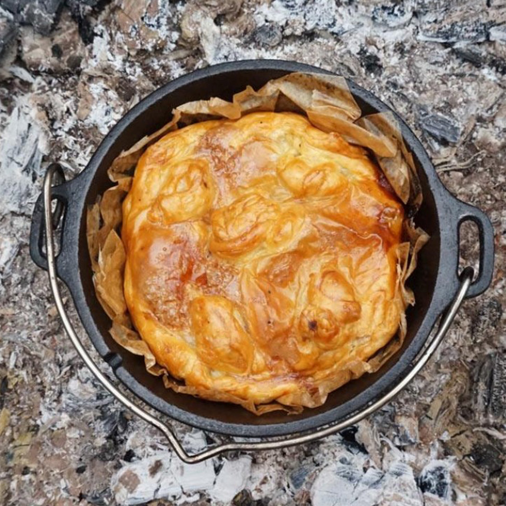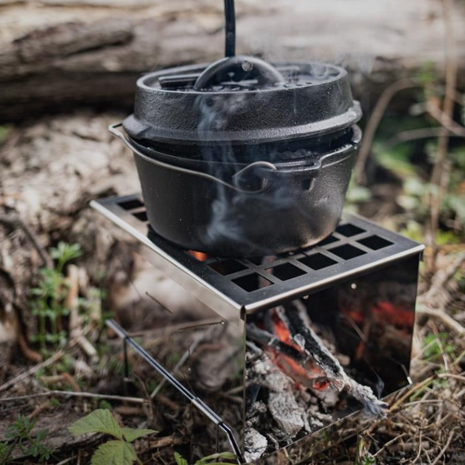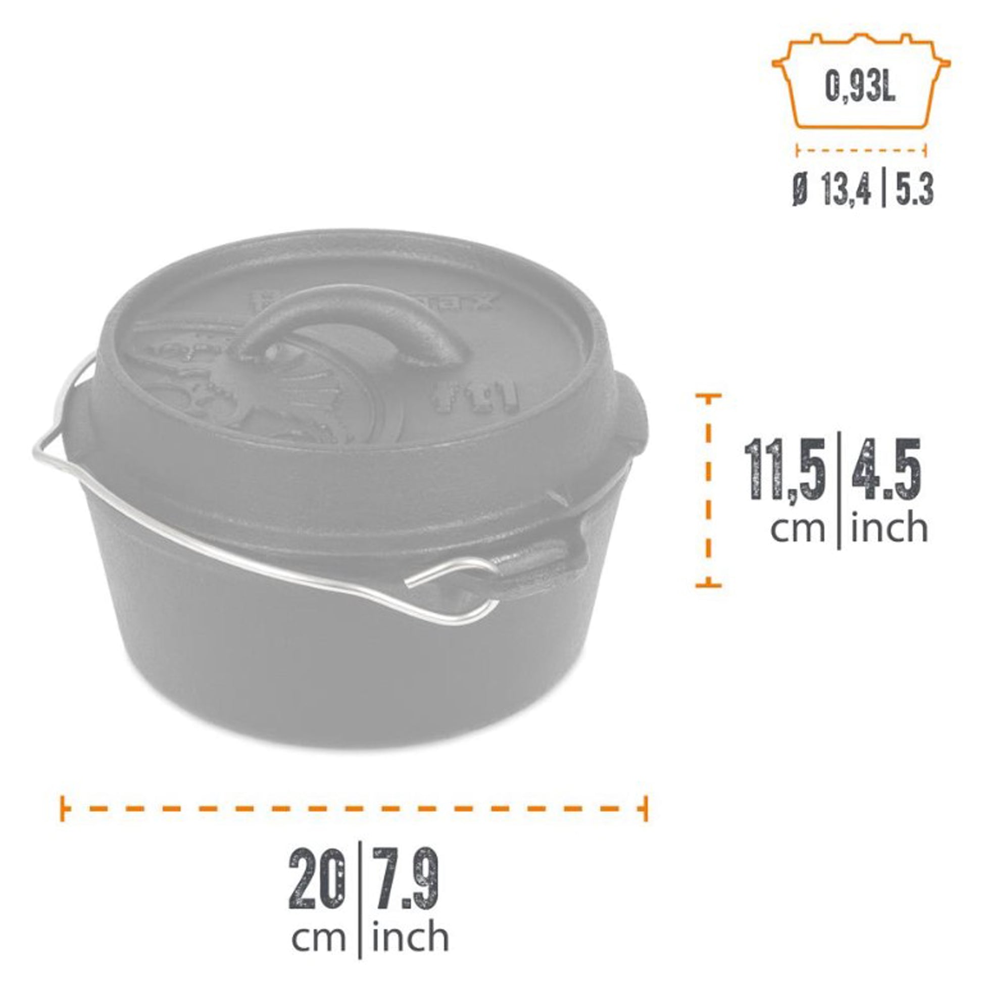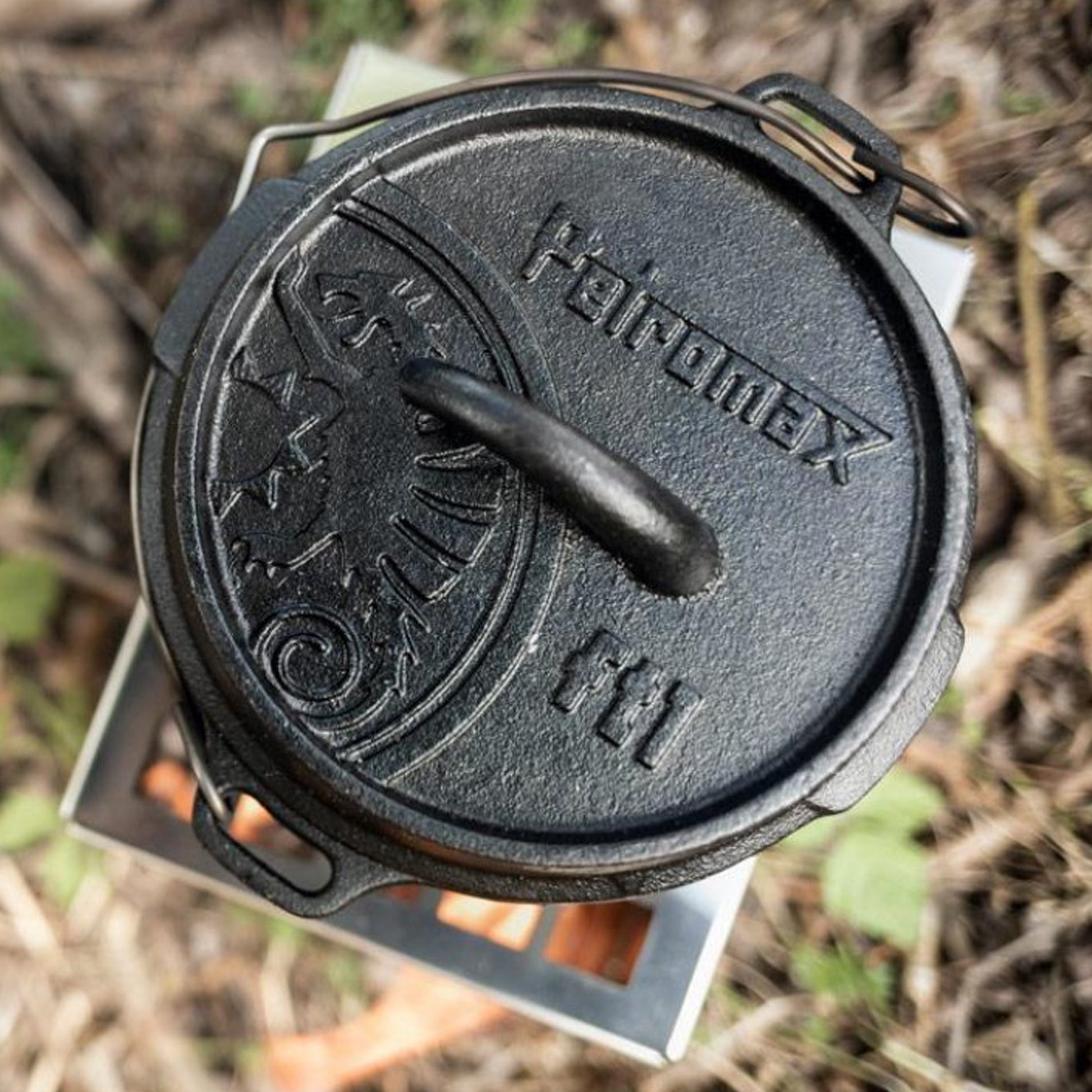 Grâce aux excellentes caractéristiques de la fonte et à la structure de surface particulière, la chaleur est conservée et distribuée de manière efficace. La surface prétraitée (culottée) rend inutile un premier culottage et la marmite en fonte robuste peut être utilisée immédiatement. En plein air, elle est utilisée sur un feu ouvert ou avec du charbon et des briquettes. Grâce au bord élevé du couvercle, braises et charbon peuvent être placés sur la marmite en fonte. La marmite est ainsi chauffée de tous côtés et permet donc aussi, par exemple, de cuire du pain.