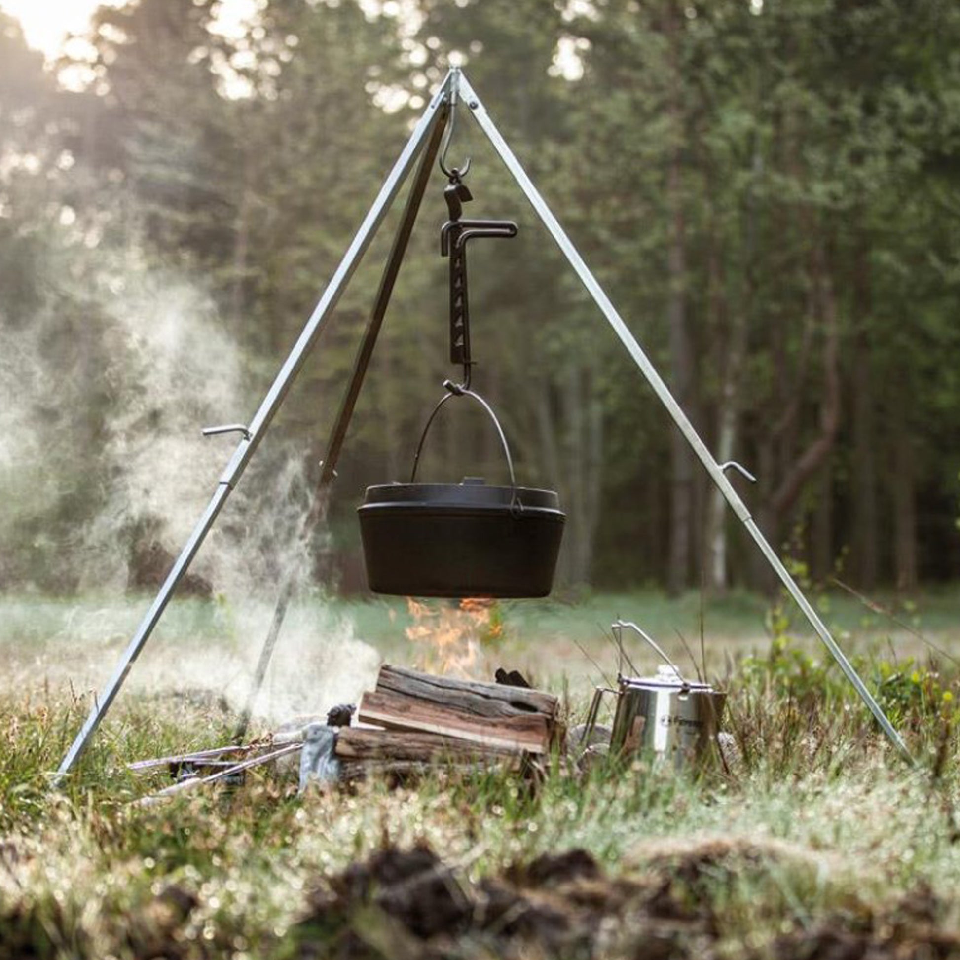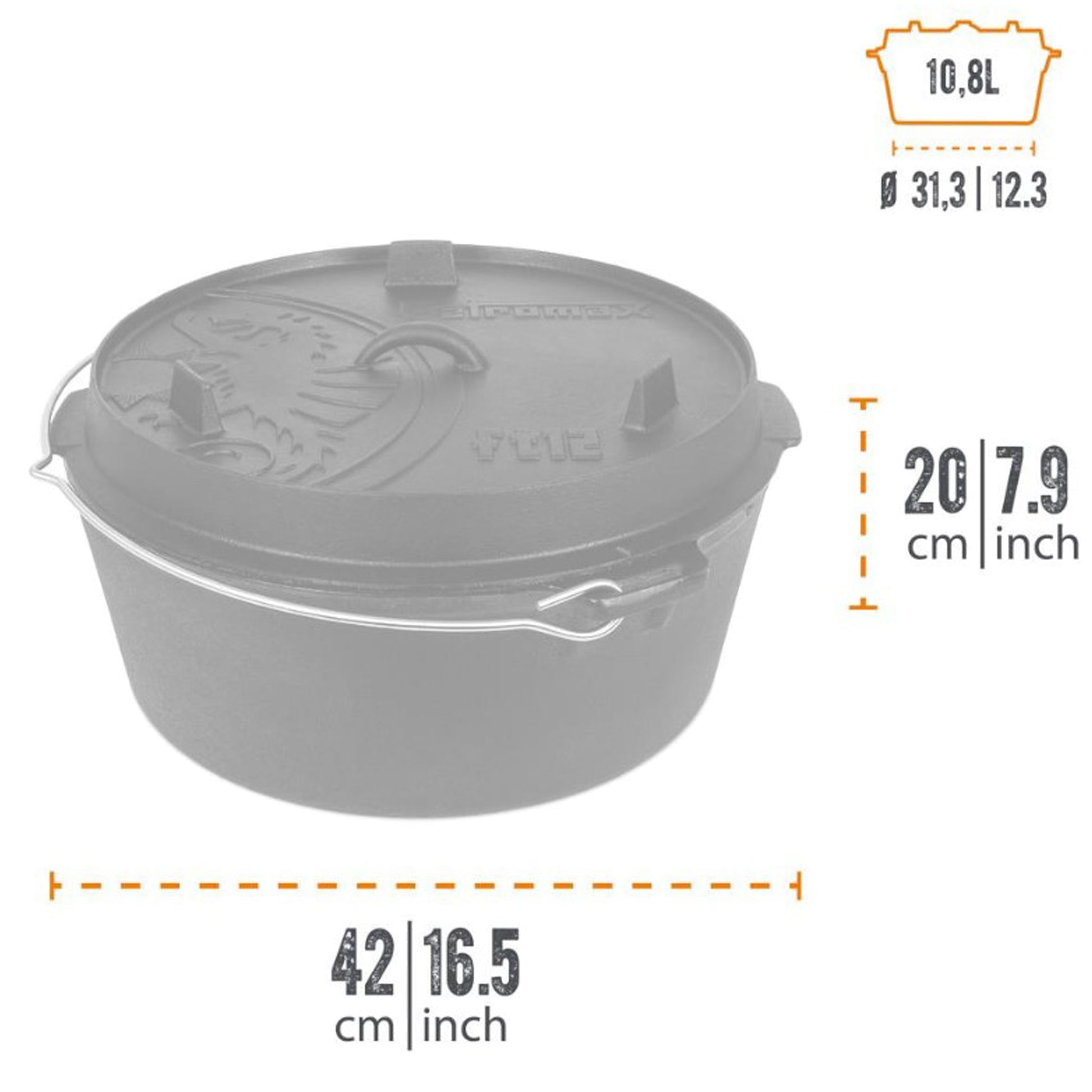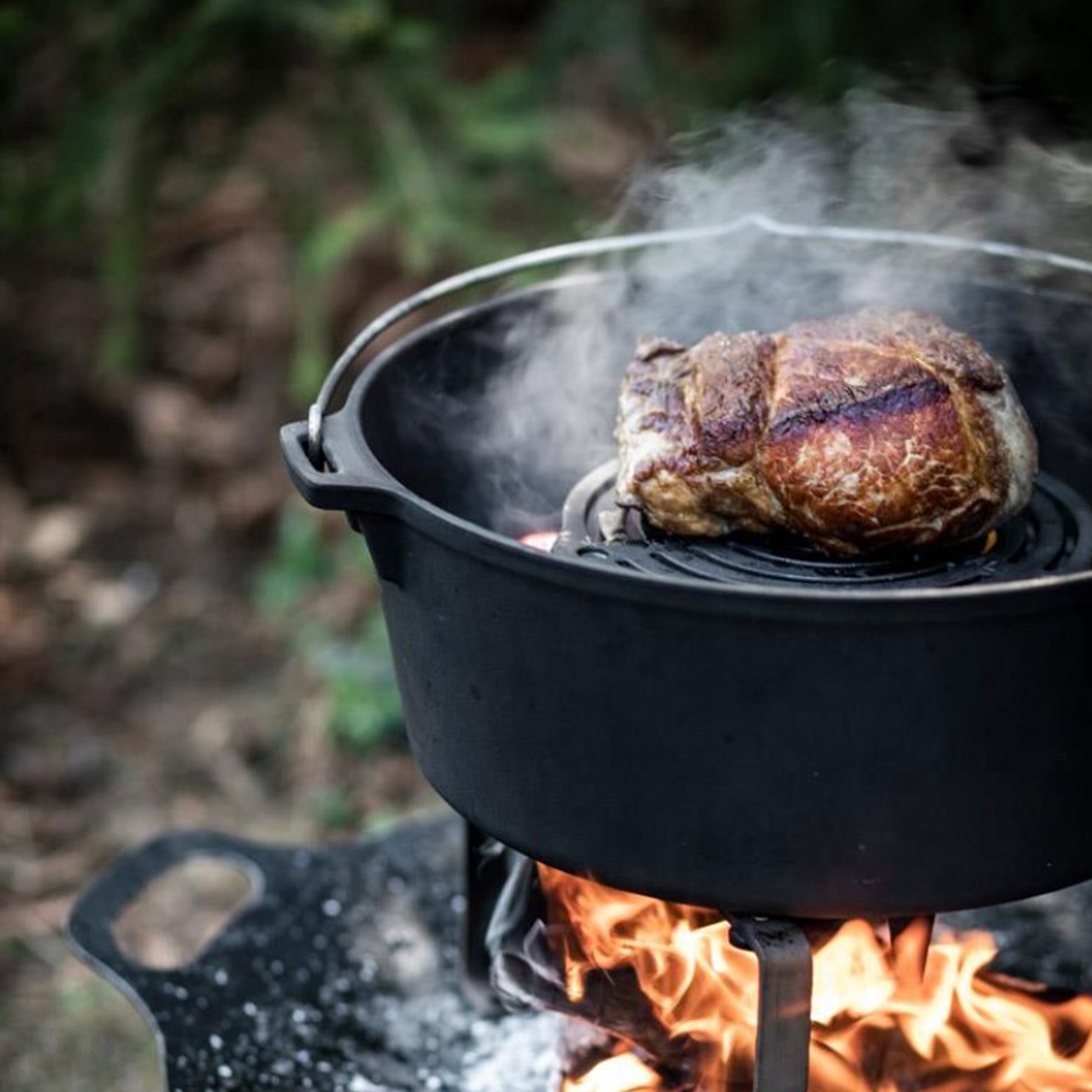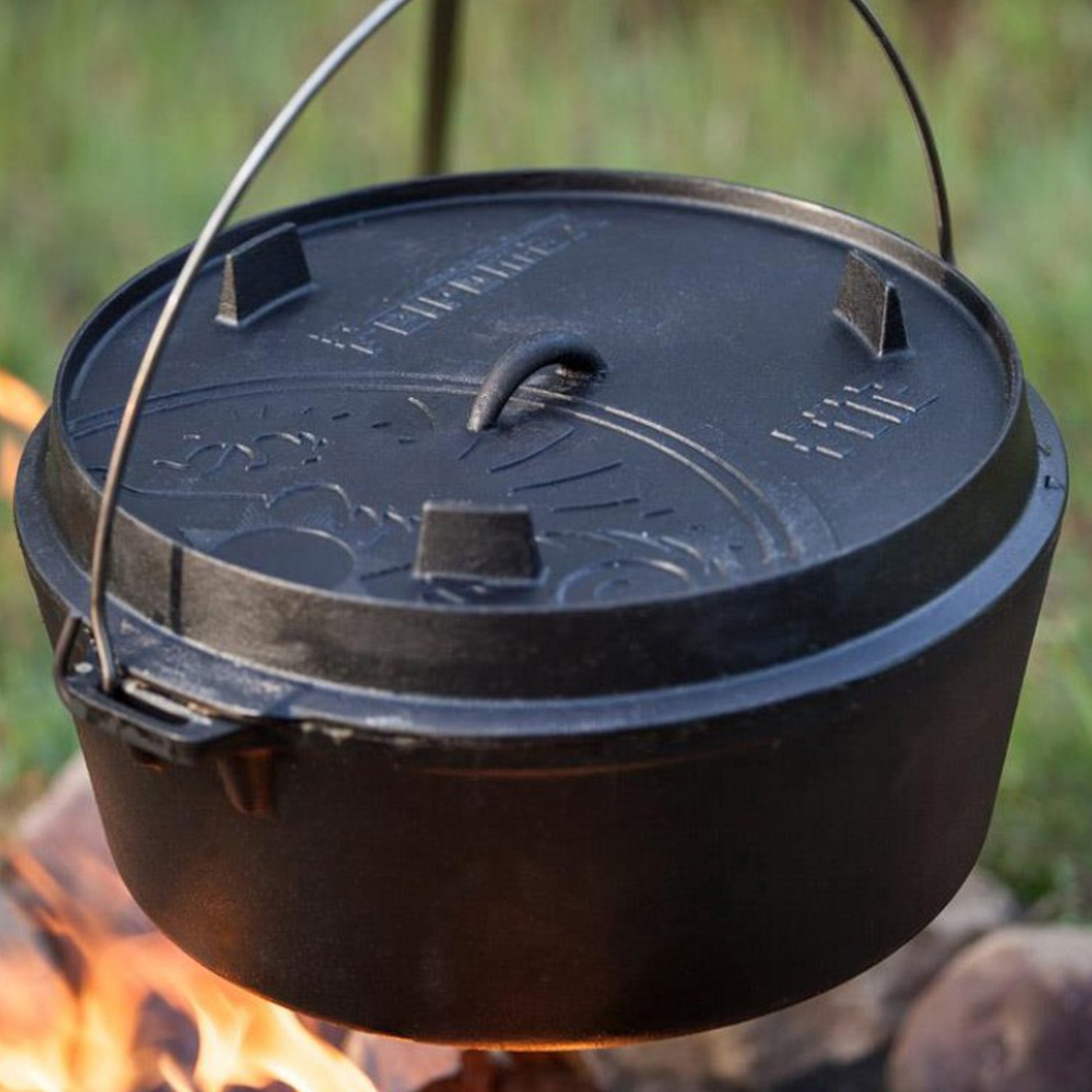 Grâce aux excellentes caractéristiques de la fonte et à la structure de surface particulière, la chaleur est conservée et distribuée de manière efficace. La surface prétraitée (culottée) rend inutile un premier culottage et la marmite en fonte, robuste , peut être utilisée immédiatement. En plein air, elle est utilisée sur un feu ouvert ou avec du charbon et des briquettes. Grâce au bord élevé du couvercle, braises et charbon peuvent y être placés aisément. La marmite est ainsi chauffée de tous les côtés et permet, par exemple, de cuire du pain.