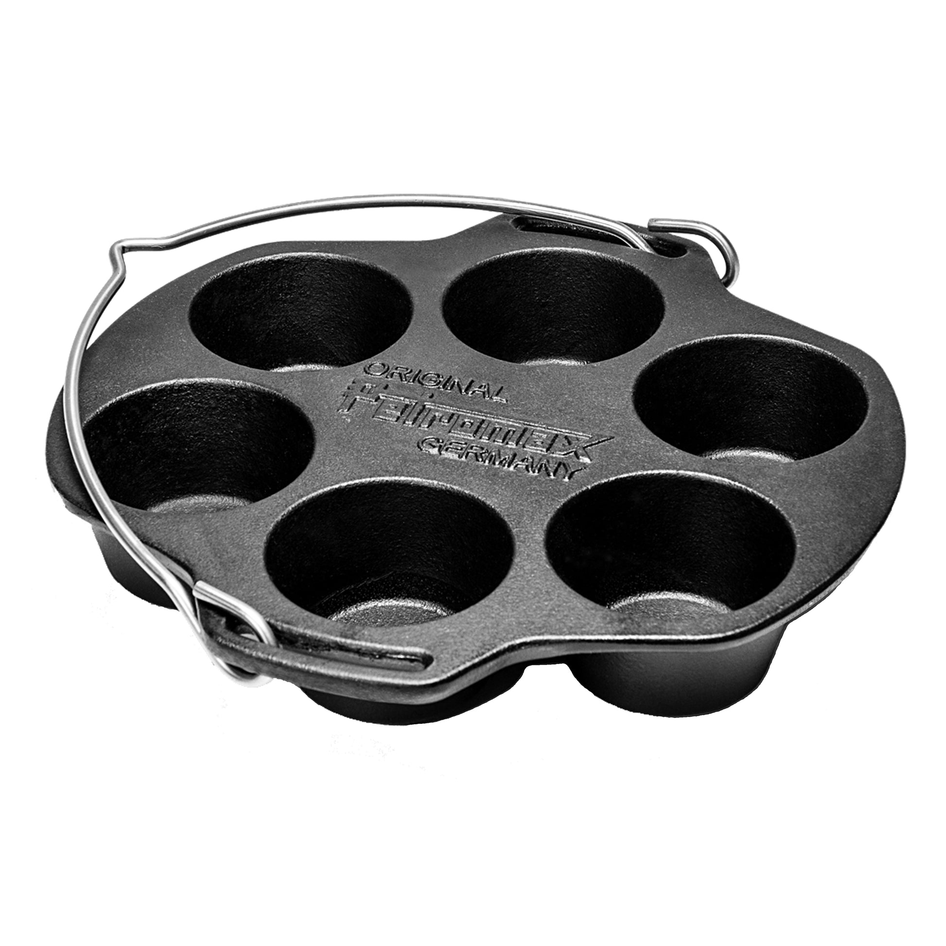 Après le moule à kouglof, le moule à pain et le moule à gratin, la série des produits Petromax en fonte est maintenant élargie grâce au Moule à muffins Petromax en fonte. Avec de la place pour un total de six délicieux petits gâteaux, tu peux utiliser le moule à muffins directement au-dessus du feu, sur les braises chaudes et dans le four domestique grâce à une anse pratique avec rainure. En outre, le moule s'insère dans les Marmites en fonte ft6 et ft9.
