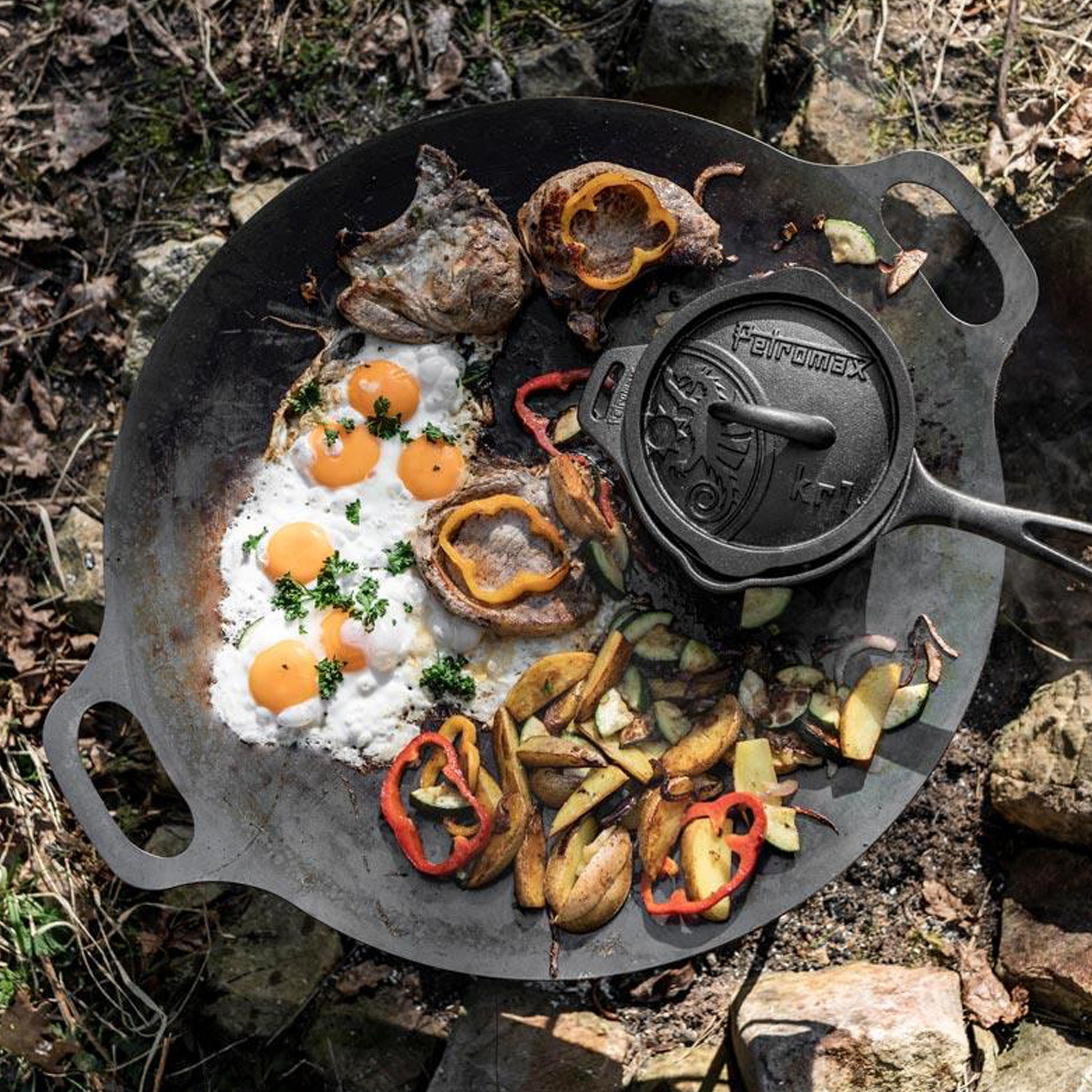La Plaque de cuisson et Brasero Petromax est l'équipement de base idéal pour réaliser de savoureuses grillades. Même débutant, vous obtiendrez un résultat de cuisson professionnel. Il suffit de visser les 3 pieds dans les filets préfabriqués et vous pouvez poser votre Plaque de gril en toute sécurité au-dessus du feu. Après le culottage, vous pouvez immédiatement commencer votre cuisson : viandes, poissons, légumes, œufs brouillés ou poêlées complètes –la Plaque de gril, vous offre une flexibilité illimitée. Pour la cuisson de vos aliments, vous pouvez choisir l´intensité de la flamme, puissante ou modérée en les plaçant au centre ou sur le bord extérieur de la plaque.