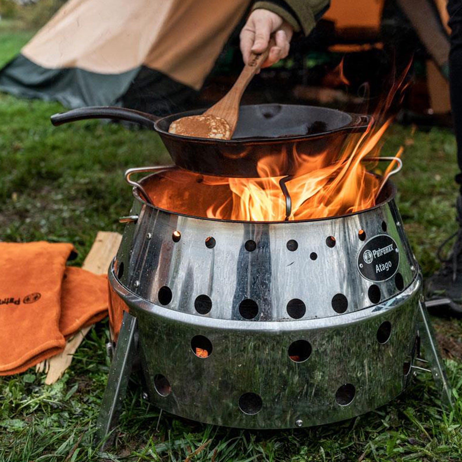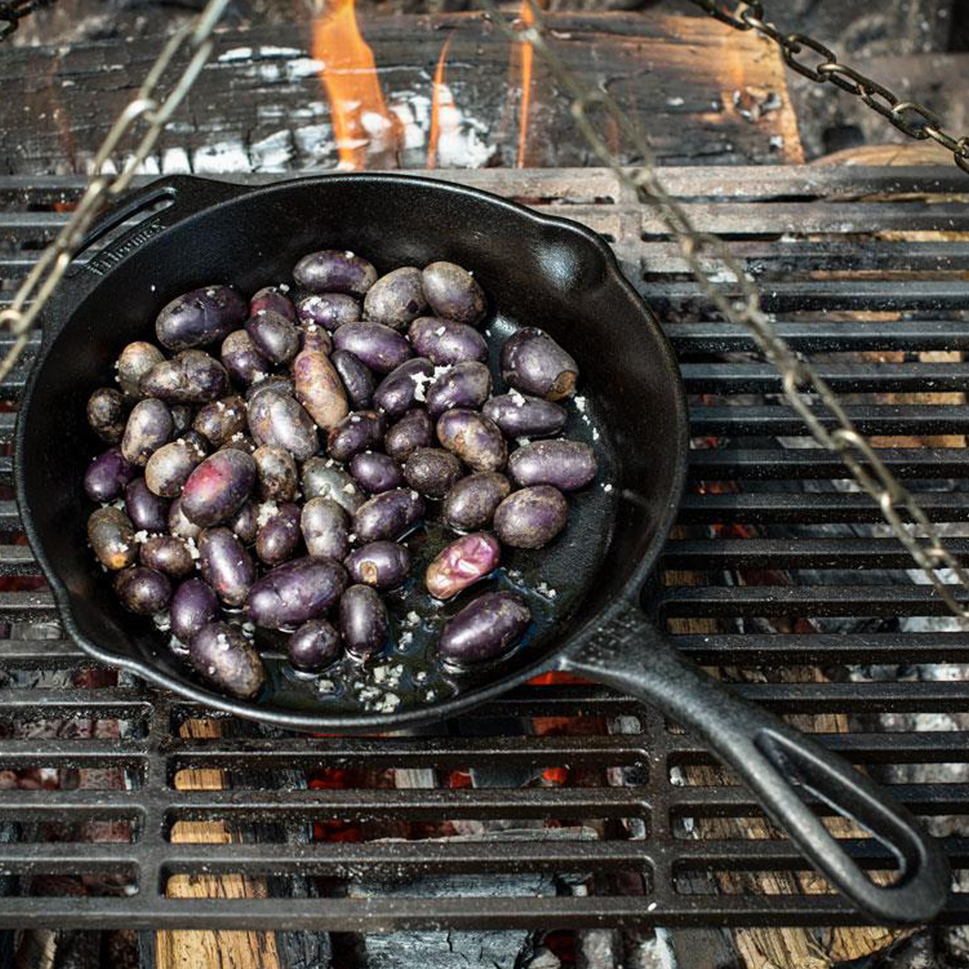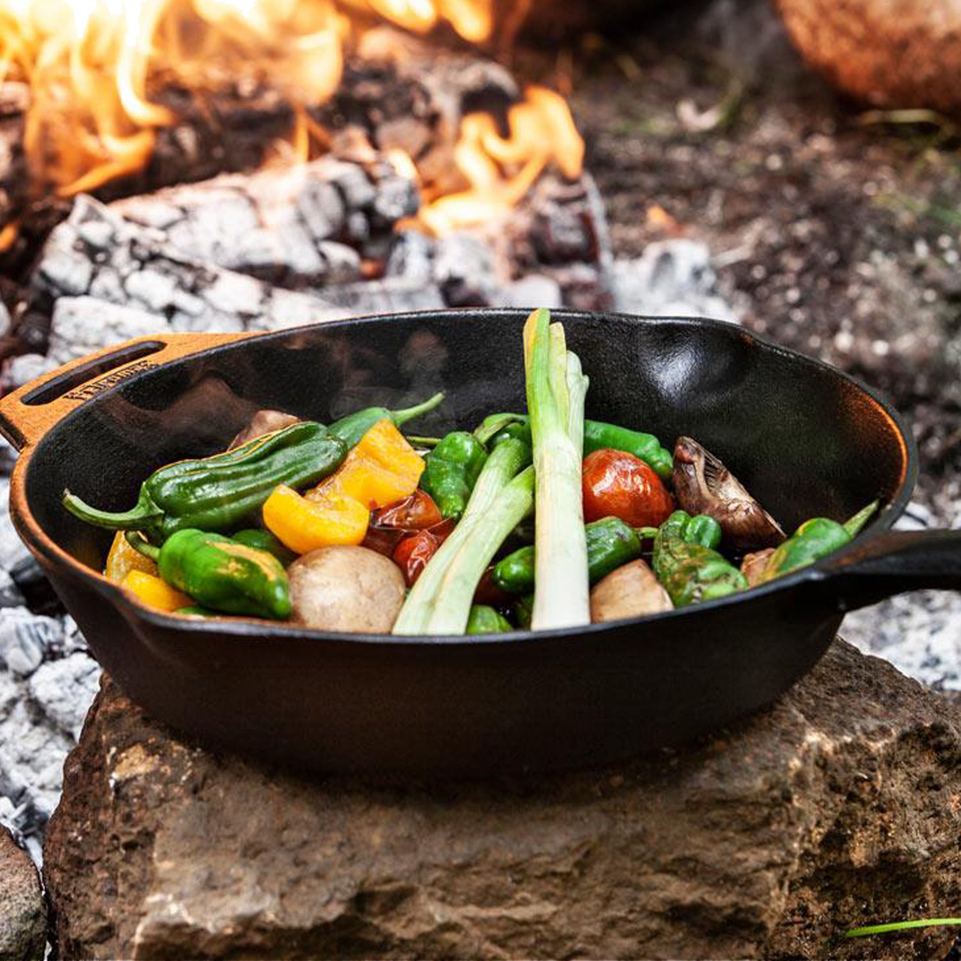 La poêle en fonte n’est pas uniquement utilisable sur une cuisinière électrique ou à induction, sur une plaque a gaz ou dans un four. Mais aussi en plein air sur un feu de camp ou un gril adéquat. Faire braiser, revenir ou sauter des aliments – dans la poêle en fonte, chaque plat est un délice.