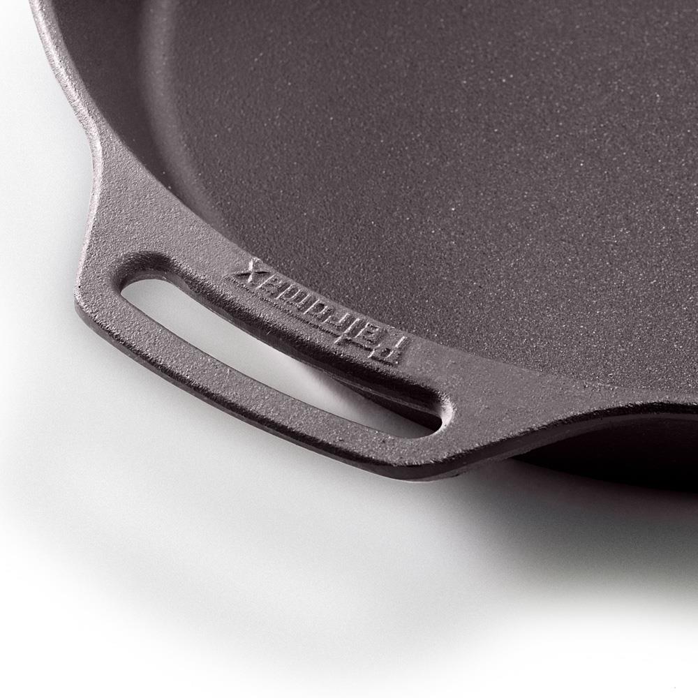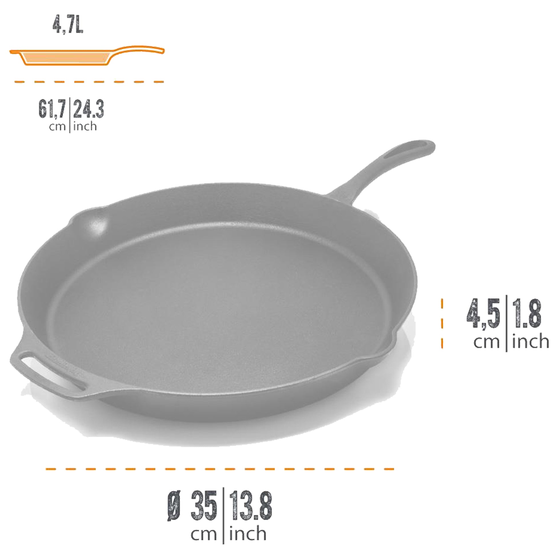 La fonte de haute qualité avec son excellente répartition de la chaleur est utilisable de suite et facile à nettoyer grâce à sa surface prétraitée (culottée). La poêle durable et robuste est naturellement antiadhésive, une caractéristique qui s'améliore à chaque usage car une patine se forme. De plus, la fonte conserve bien la chaleur, et c'est pourquoi tu peux servir tes plats directement dans la poêle.