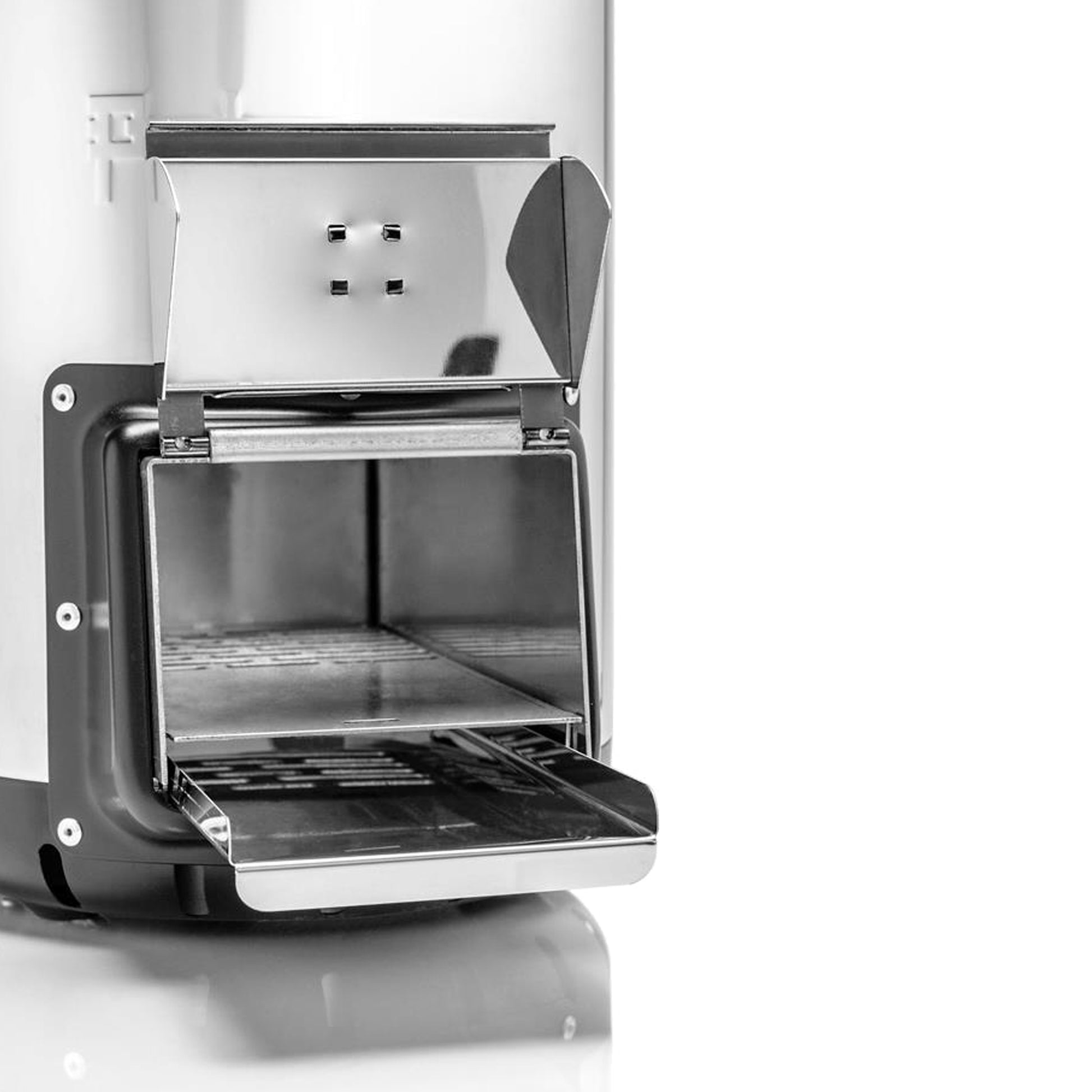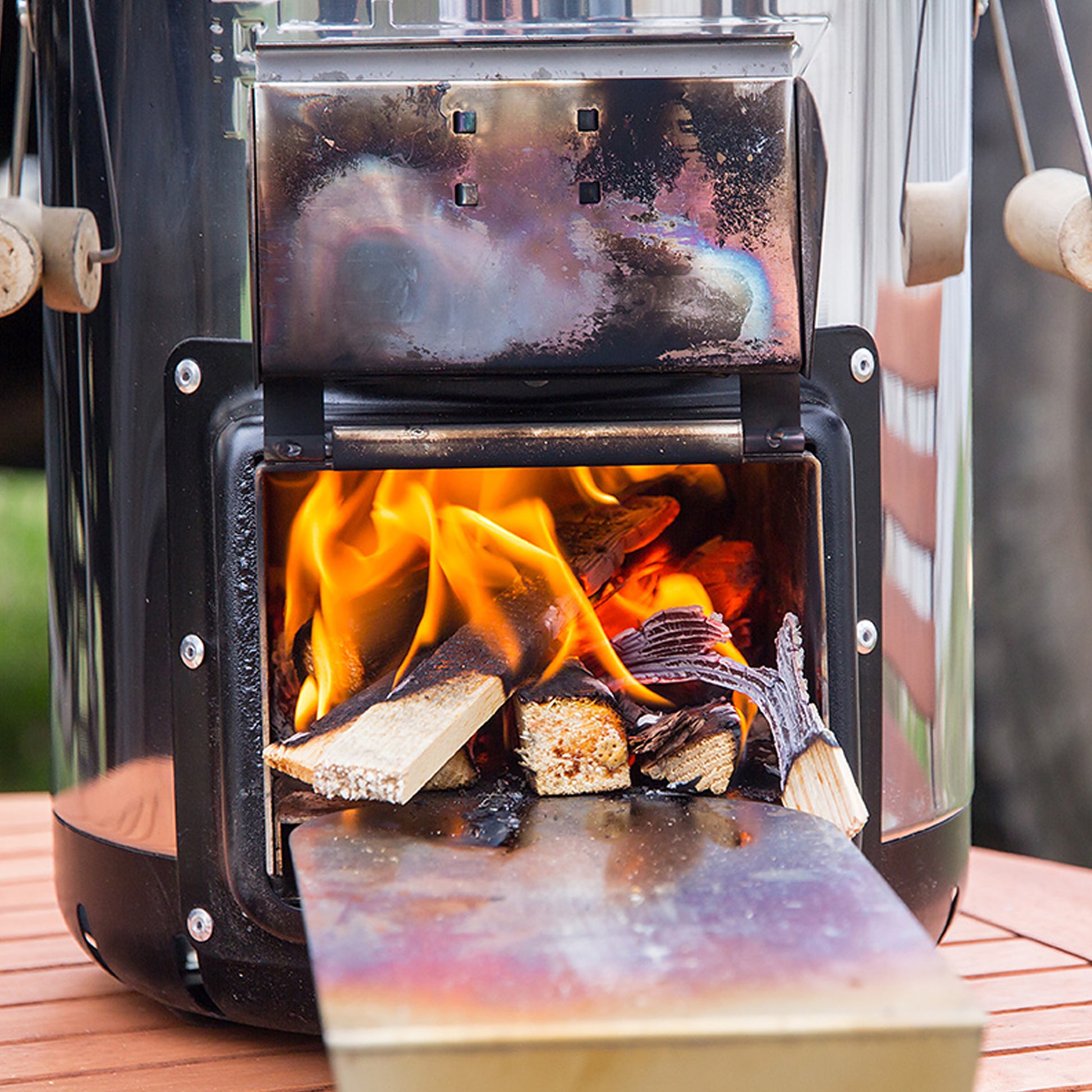 Il suffit de placer le bac à cendres, puis d'ouvrir complètement le clapet de la chambre de combustion et d'y positionner un kit de feu directement au milieu de la chambre de combustion et d'y placer le bac à cendres. Vous pourrez alors positionner un kit de feu directement au milieu de la chambre de combustion et l'allumer. Grâce au plateau à combustible, vous pourrez ajouter des brindilles et des branches en continu et en toute sécurité.