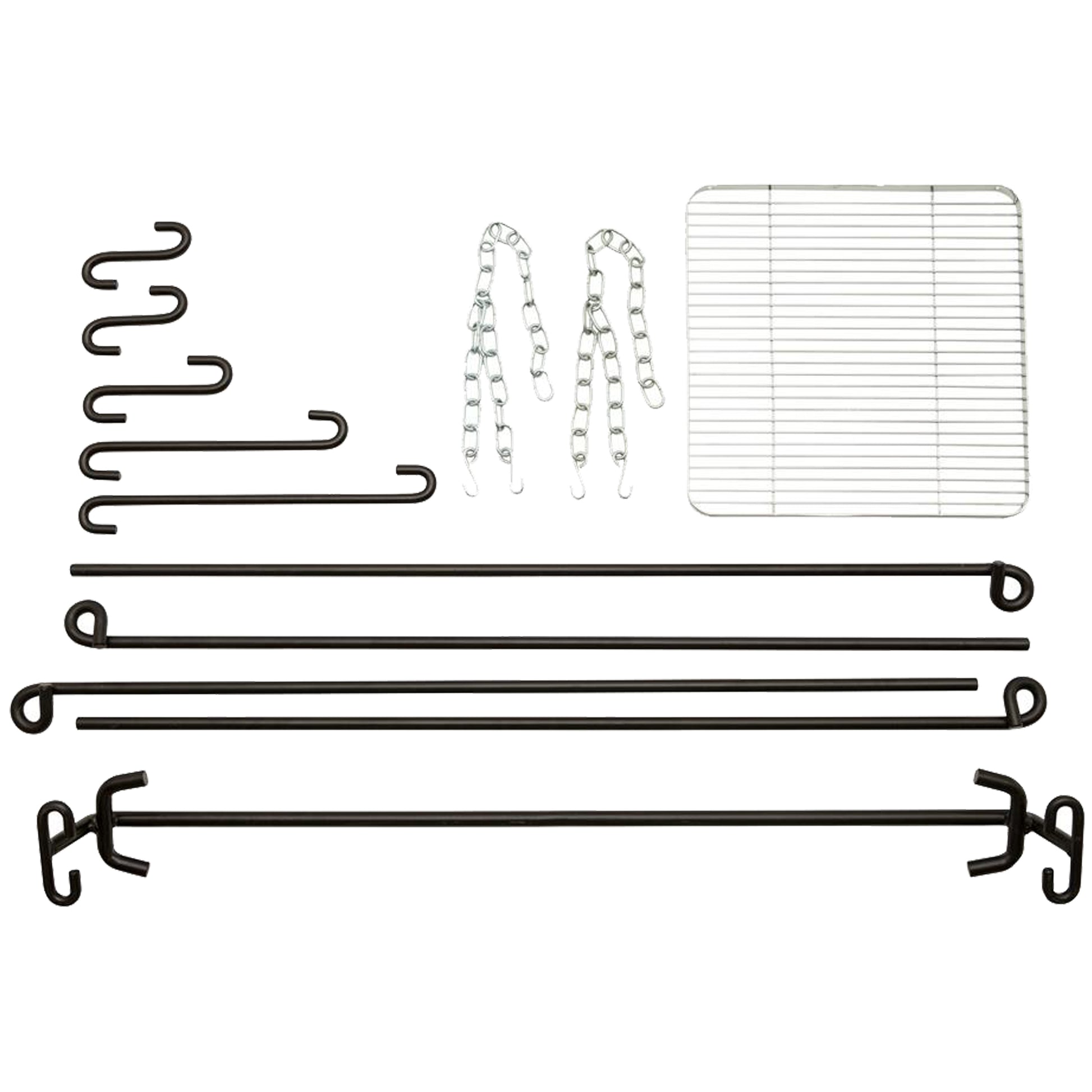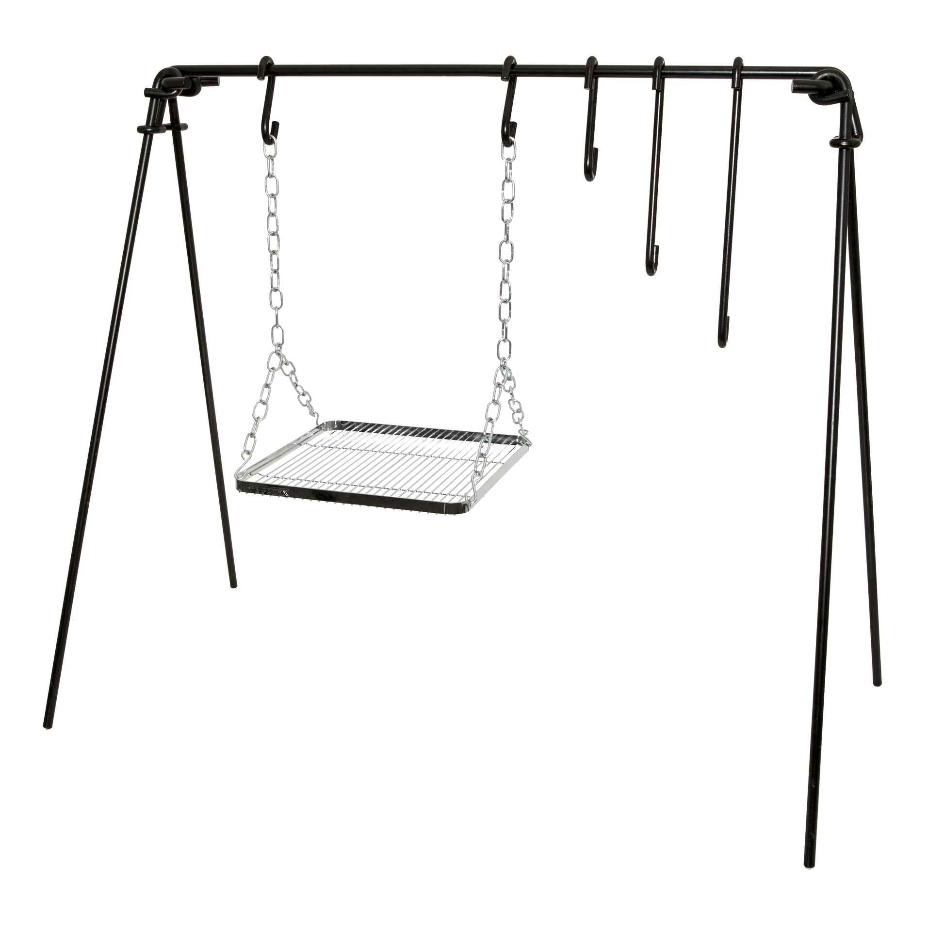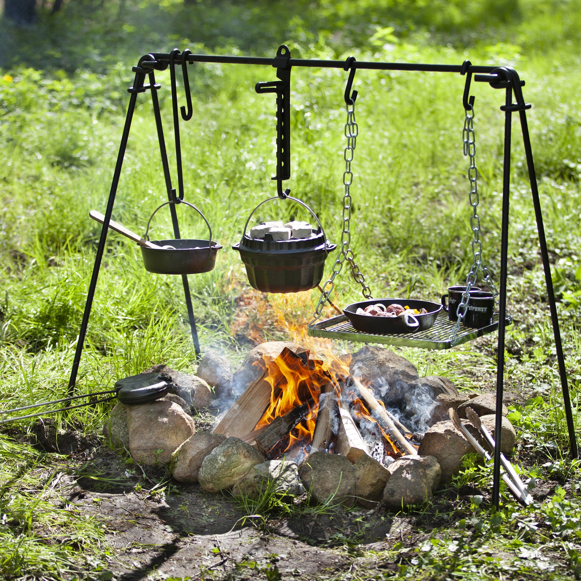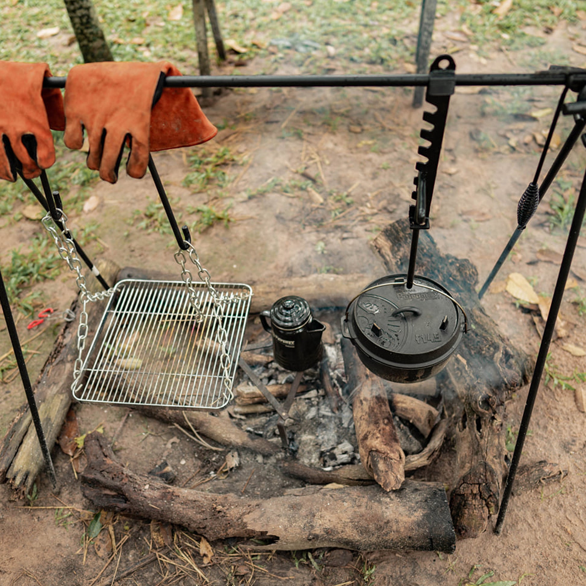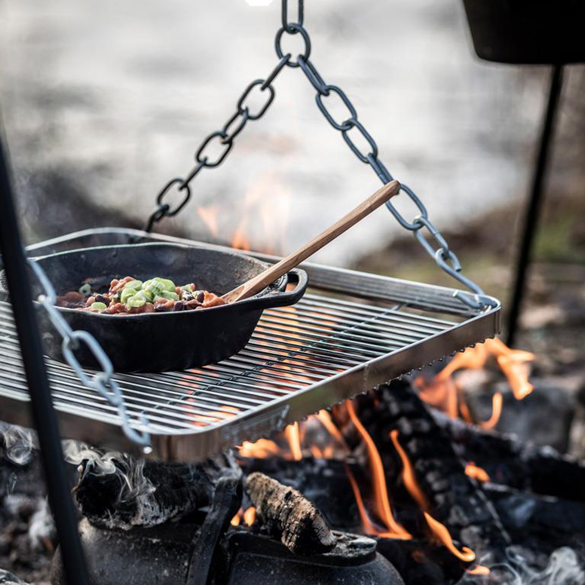 Grâce à sa construction en œillets, le Pont de chauffe peut fonctionner en toute sécurité à quatre jambes et est prêt à être utilisé en un rien de temps du tout. En raison de la barre transversale d'une longueur de 115 cm, la pratique de cuisine de camp peut être réalisée sur un ou plusieurs foyers. Les trois crochets de différentes longueurs permettent l’accrochage des marmites en fonte, des bouilloires et des cruches en trois étapes au-dessus du feu. Le gril est réglable en hauteur par la chaîne. La bordure environnante tient en place les aliments, les casseroles et des autres aliments en toute sécurité. Avec cette cuisine extérieure professionnelle, les menus de feu de camp à plusieurs services ne représentent plus un défi pour tous vos amis.