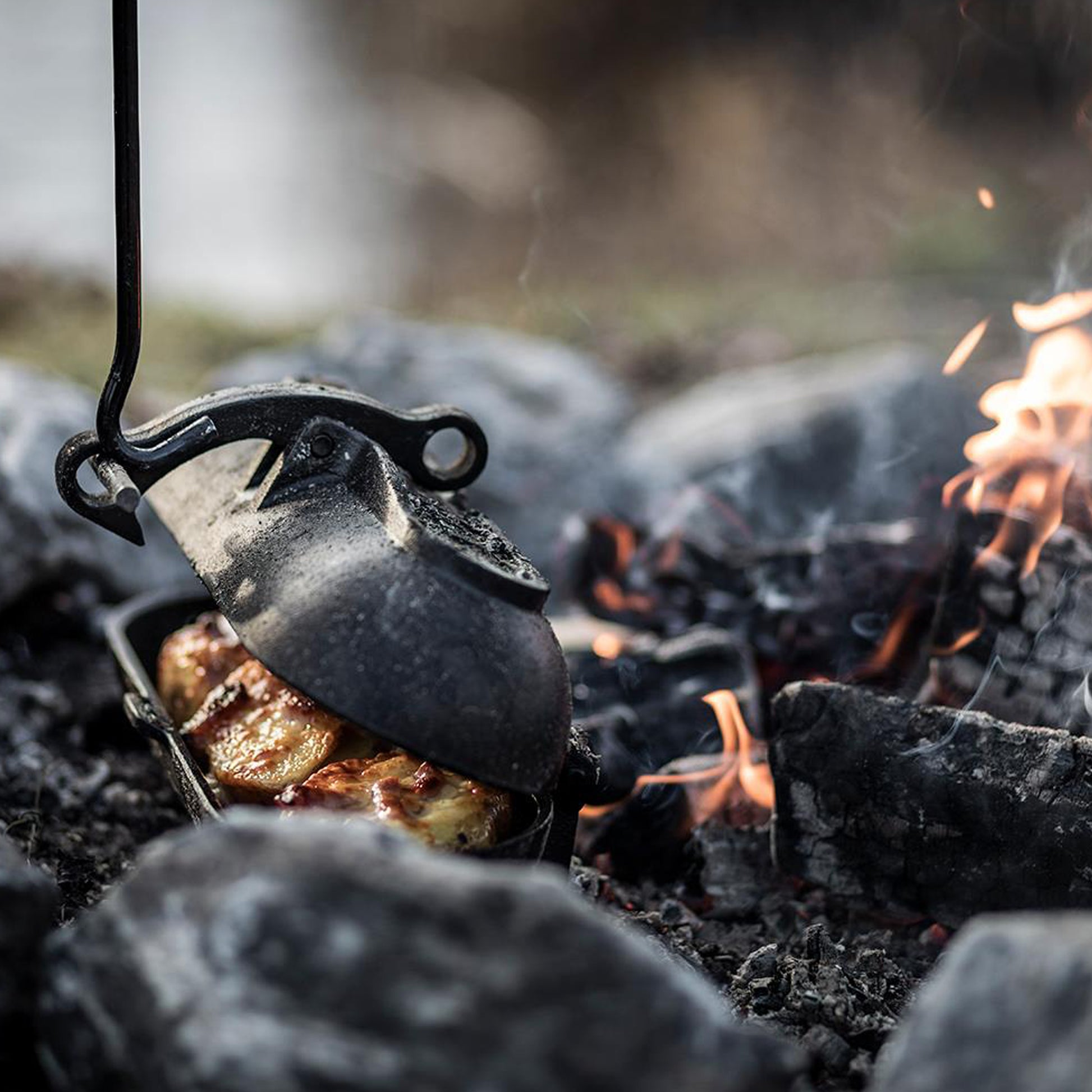 Le rebord périphérique sur le couvercle vous assure un contrôle optimal de la température. Vous pouvez y placer des briquettes ou des braises et ainsi déterminer de façon précise la chaleur supérieure pendant la cuisson. Grâce à son rebord inférieur qui crée une surface de pose plane, la Rôtissoire à pommes de terre reste bien stable. Que ce soit directement dans les flammes du foyer ou dans le four. Le rebord s'étend jusqu'en dessous des charnières et garantit ainsi une ouverture sans risque de basculement.