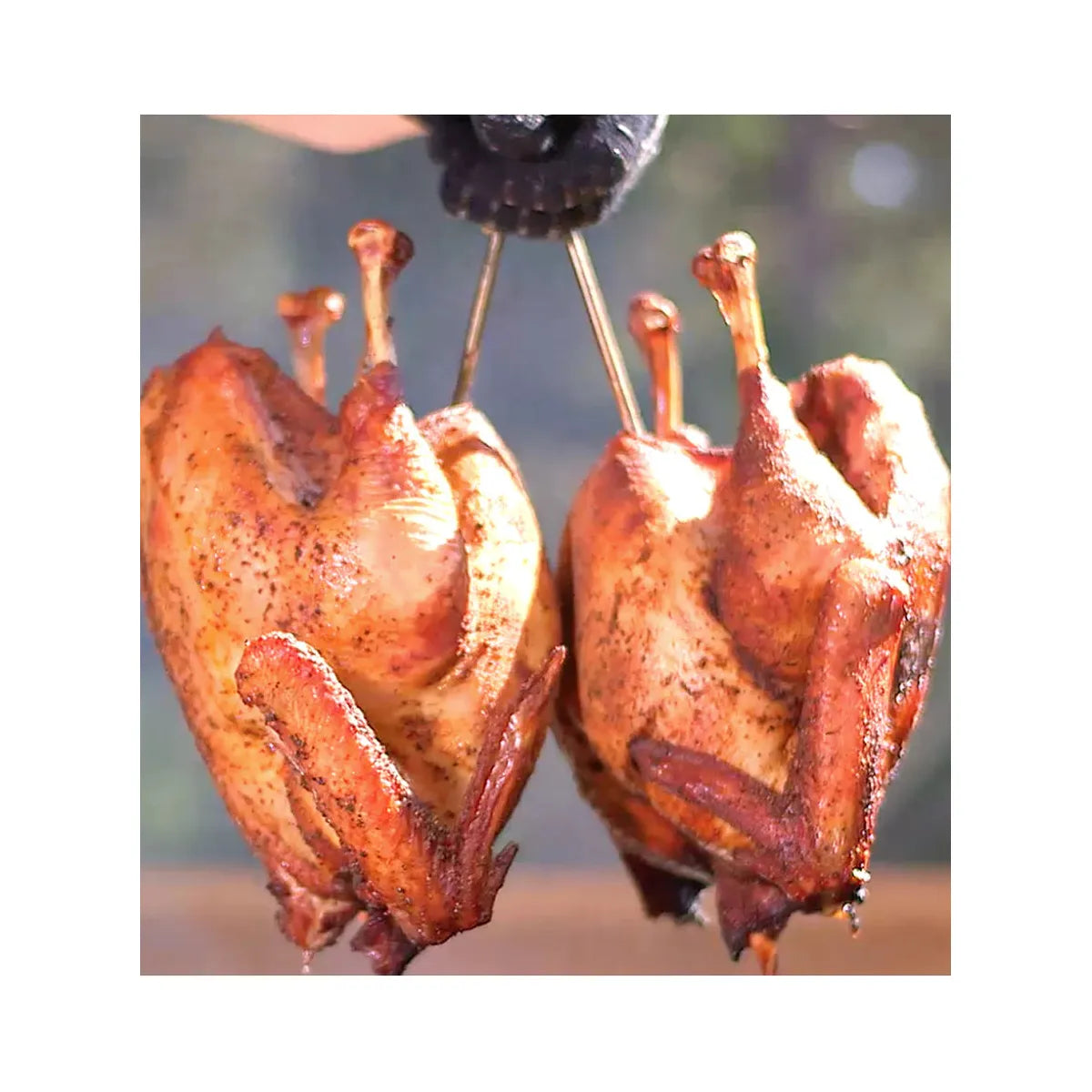 Idéal pour les dindes, les poulets, les canards, les oies et autres volailles, nos crochets de suspension pour volaille en deux pièces en acier inoxydable sont l'appareil ultime pour cuisiner vos oiseaux. Le processus est simple et les résultats sont si délicieux que vous ne les ferez plus jamais frire ni les remettre au four. Plusieurs crochets de suspension pour dinde sont parfaits pour les grands festins et/ou pour ajouter de la variété. Fabriqué en acier inoxydable soudé durable.