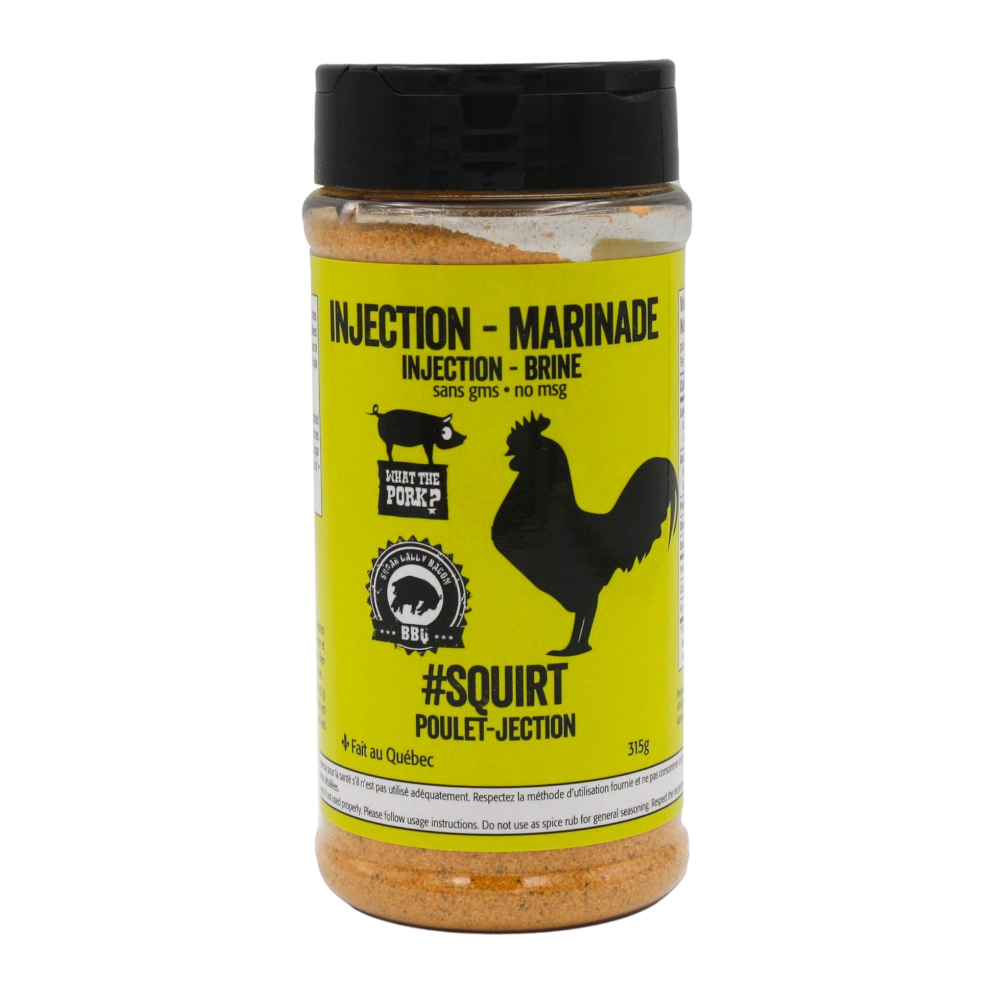 Mode d'utilisation: Incorporer 1/4 de tasse d'épices (45g) à 2 tasses d'eau (473 ml), bien mélanger et laisser reposer 30 minutes au réfrigérateur. Bien agiter et injecter dans minimum 1.3 kg de viande.