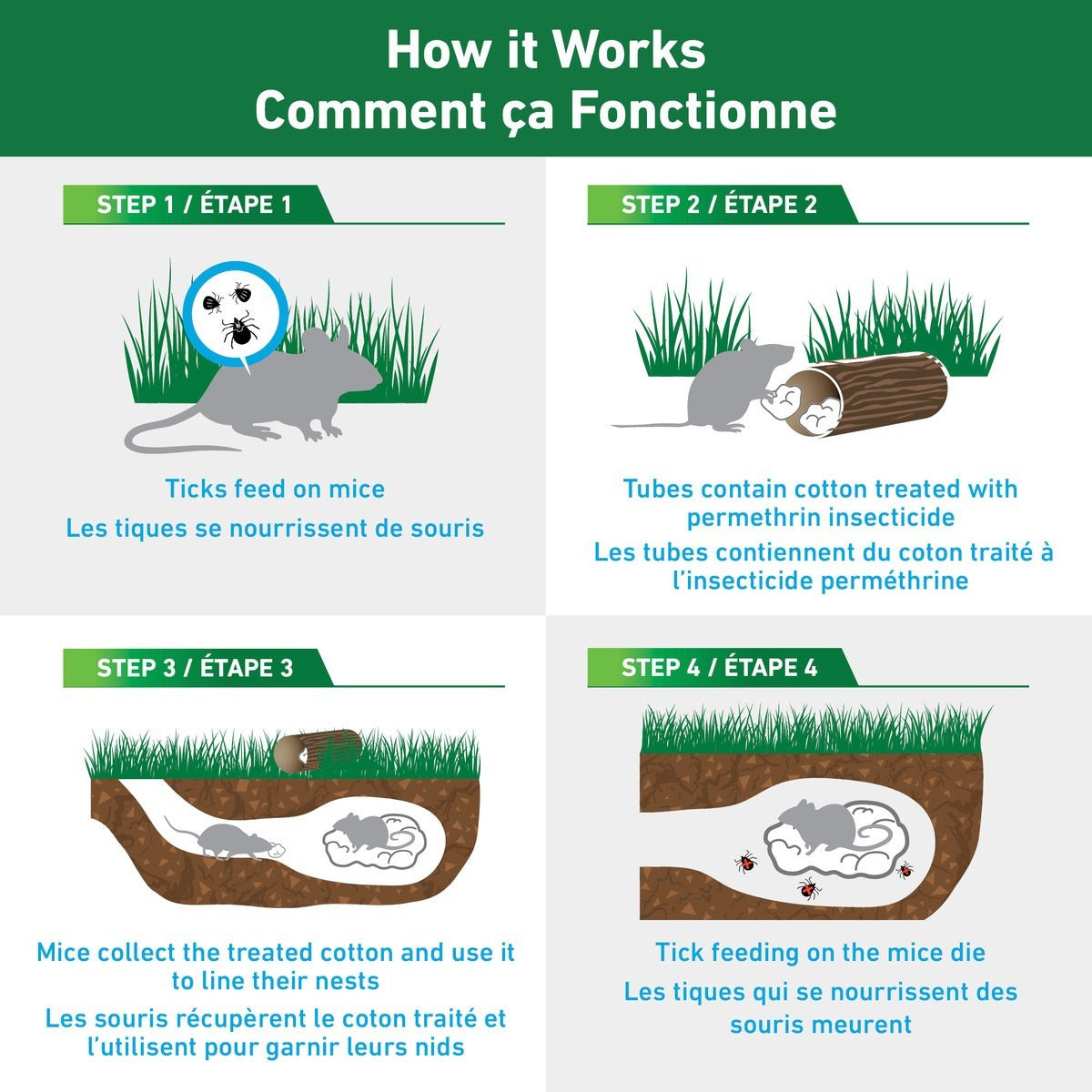 Les souris collectent le coton traité pour construire leur nid. Une fois exposées à la perméthrine, les tiques qui se nourrissent sur elles sont éliminées, réduisant ainsi leur présence dans votre environnement.
