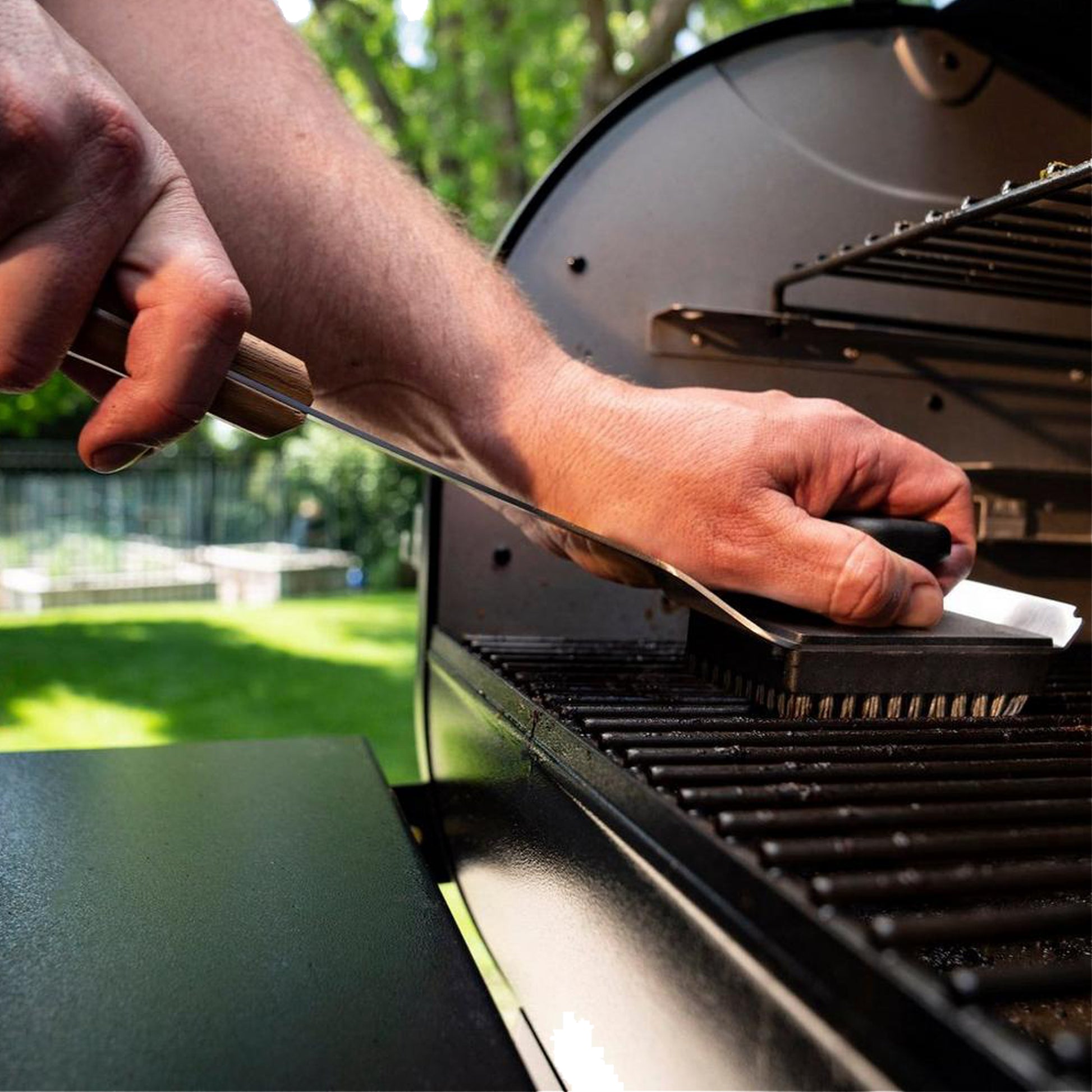 Voici un moyen plus sûr de nettoyer les grilles de barbecue refroidies. Notre brosse de nettoyage pour barbecue Traeger est dotée de poils en nylon qui n’endommageront pas vos grilles et ne se retrouveront pas dans votre hamburger.