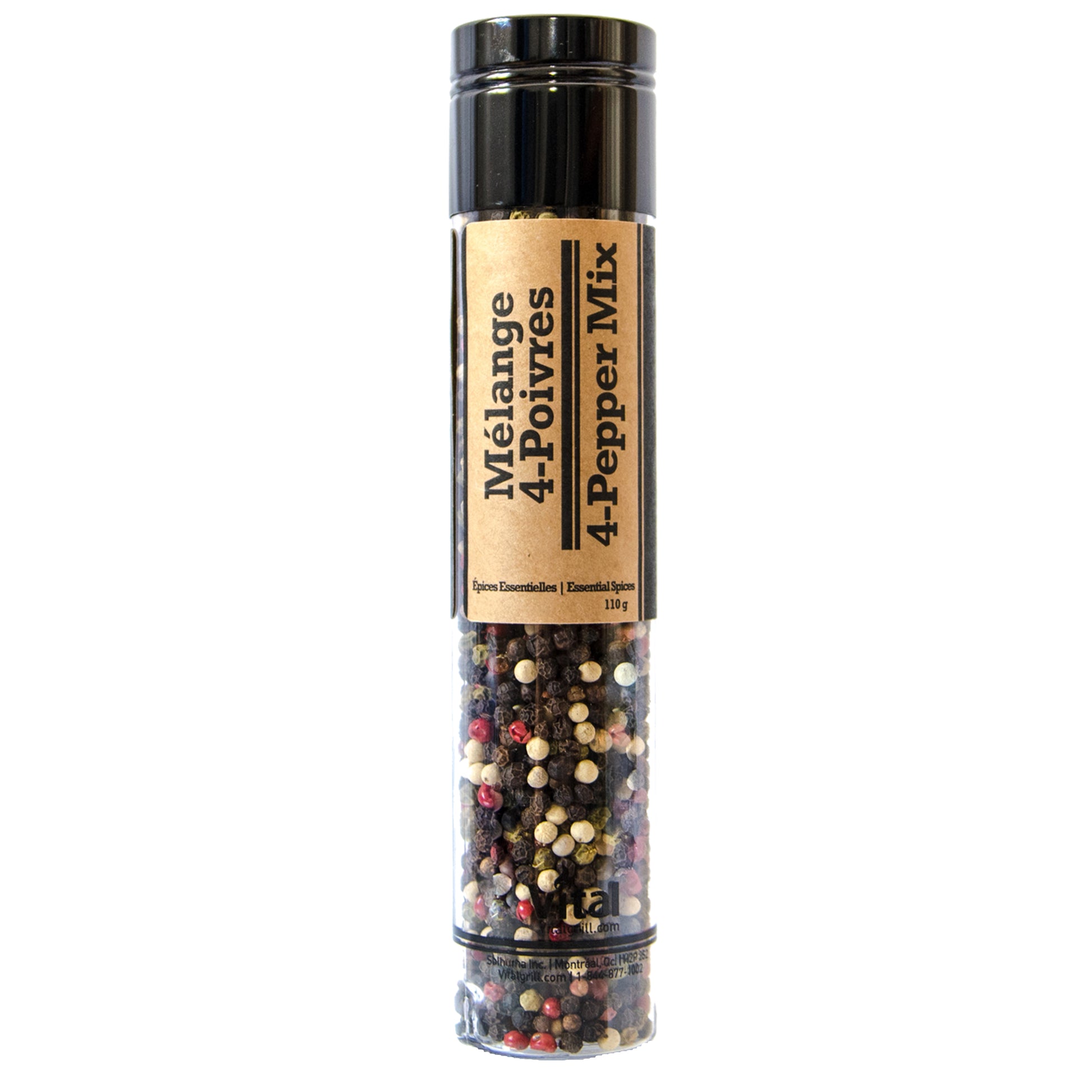 La quête de l'équilibrium est un des buts ultime de la cuisine. Une balance d'intensité atteinte par un agencement unique de 4 variétés de poivres différents nous rapprochons de cet équilibrium. Combinez ce mélange parfait pour rehausser tous vos mets et grillades et laissez pipérine subtile vous transporter au pays des arômes.